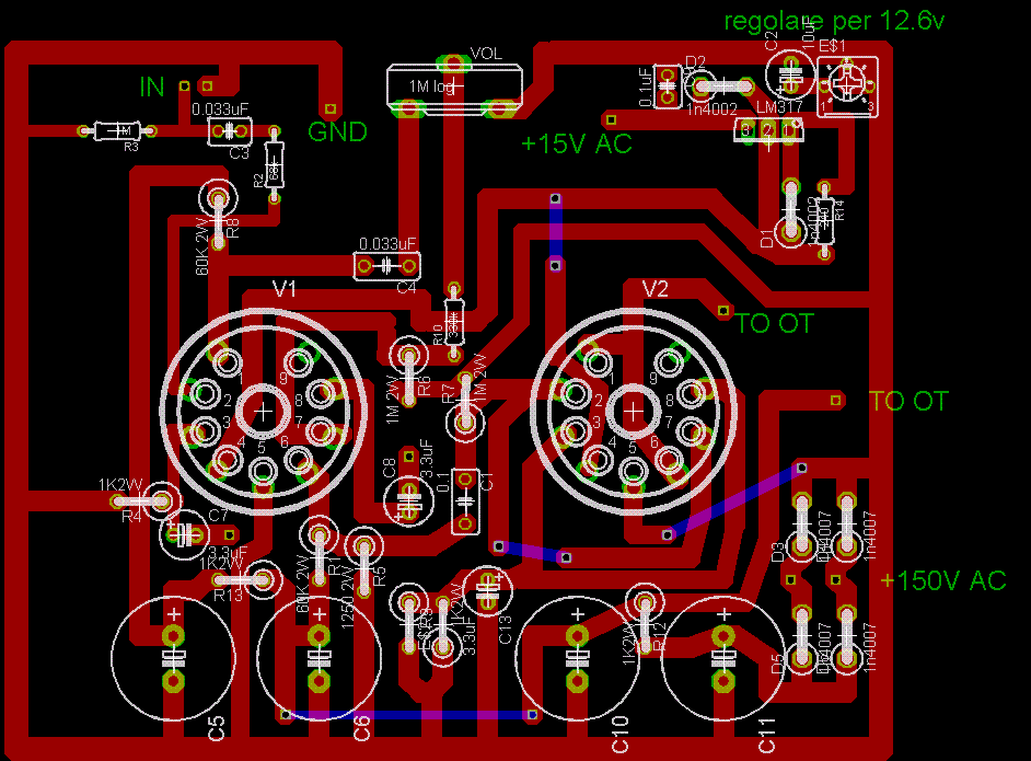 Il trasformatore è avvolto su misura, è da 130V 50mA + 6.3V 2A, vi consiglio di farlo fare a 150V in quanto la tensione si abbassa un po, è di 170V anzichè 180V....
