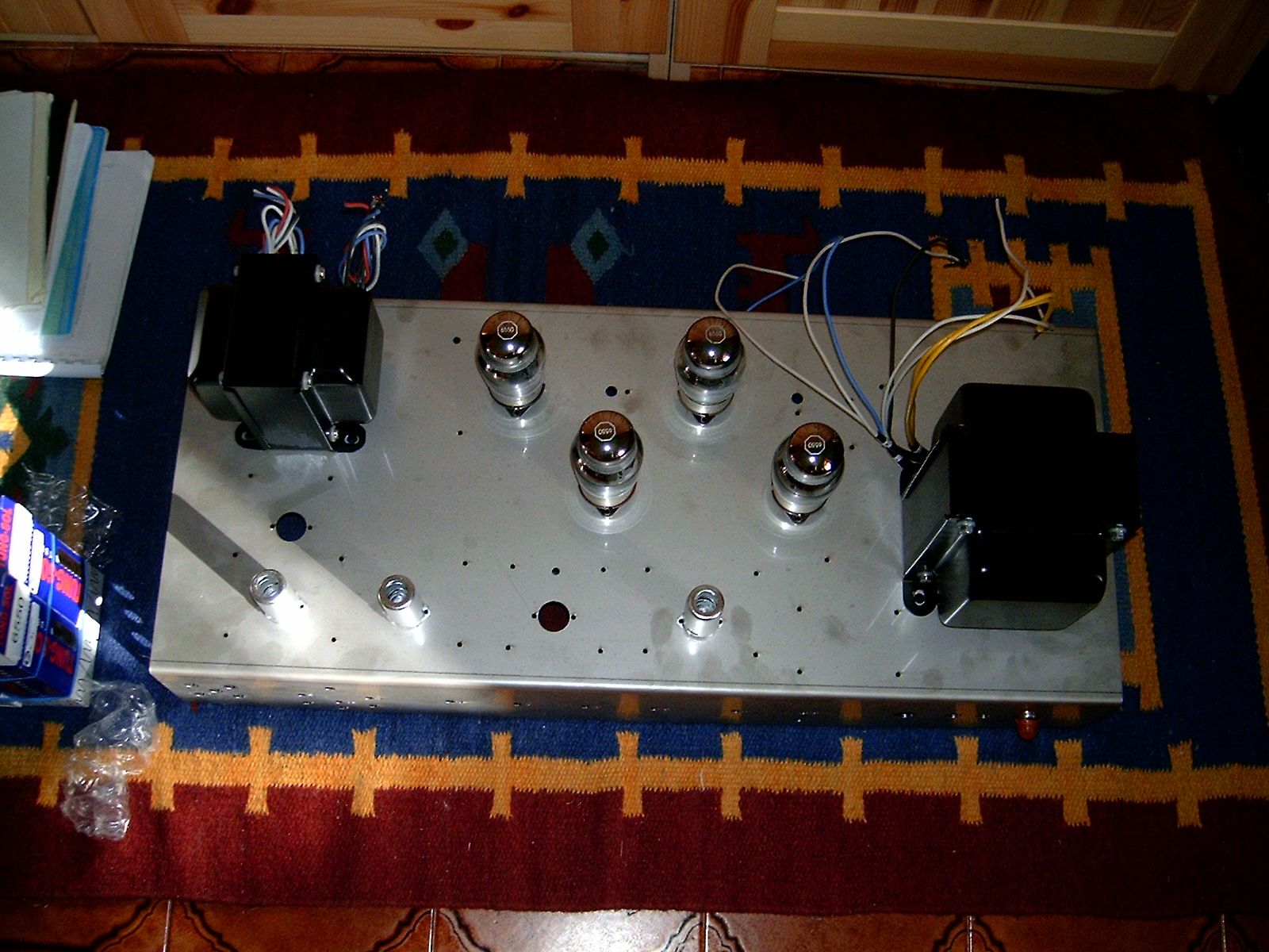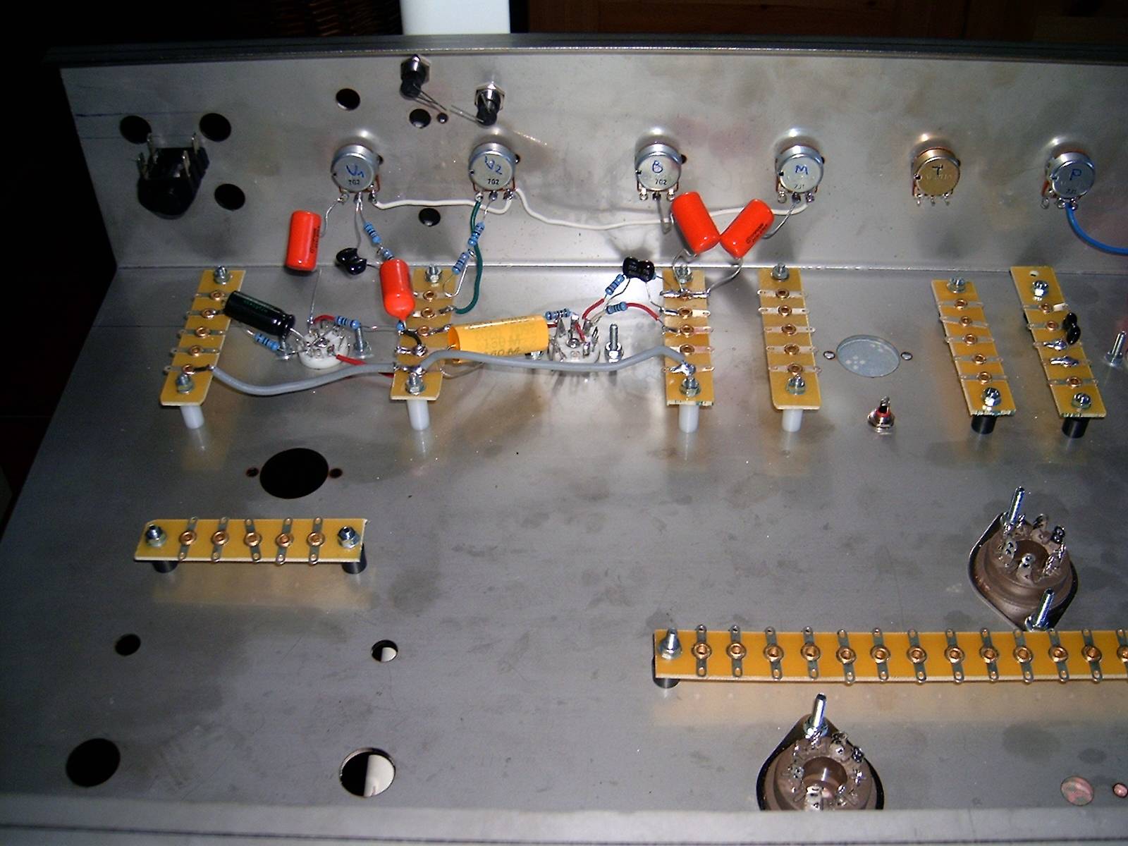 Nel frattempo vi mando un pò di fotuzze. Vi allego lo schema originale, quello modificato da me (ho aggiunto una valvola di boost e una per il reverbero a molle), la foto dei trasformatori, e il layout dell'ampli che ho iniziato a fare con il cad; ovviamente lo farò point-to-point! eheh