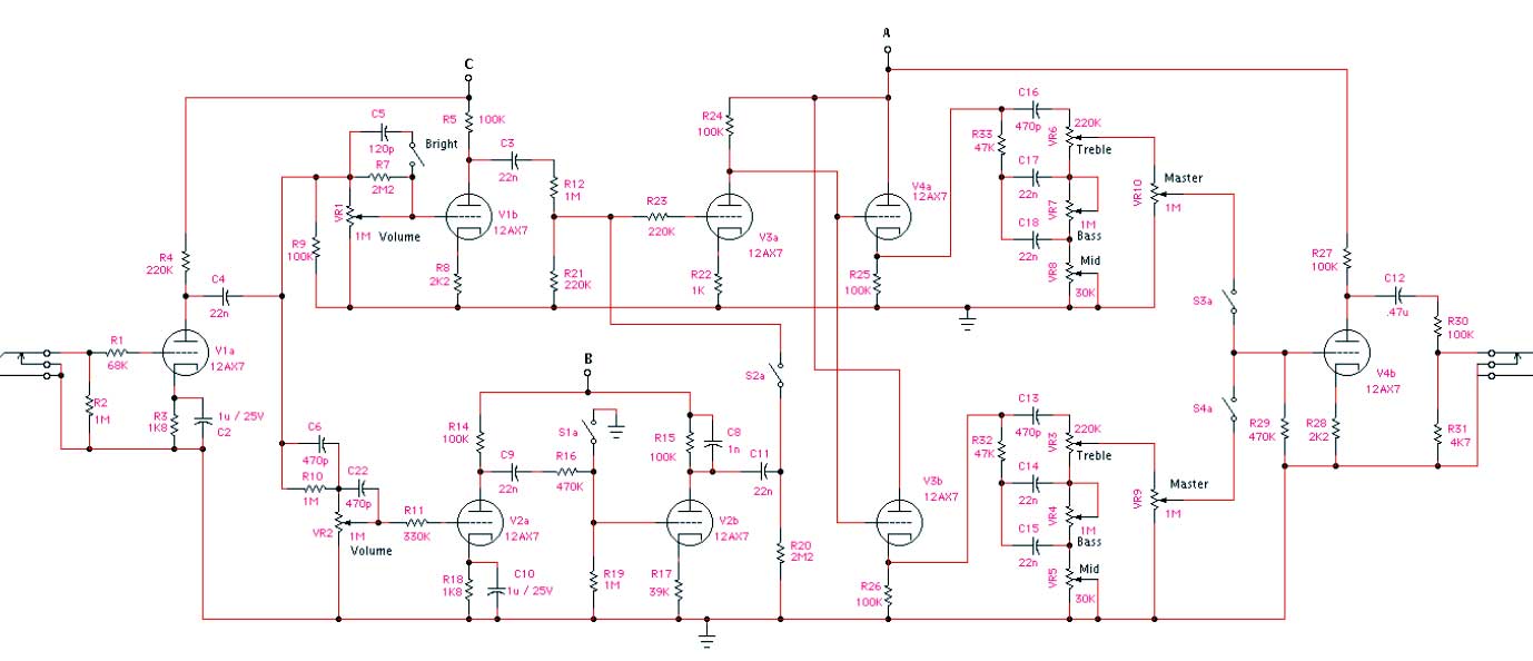 La base di partenza è stata un Soldano SP77, a cui ho marshallizzato la pasta del lead togliendo bassi nei primi stadi, tagliando molto meno alti negli stadi centrali e dando mediobassi negli ultimi stadi.