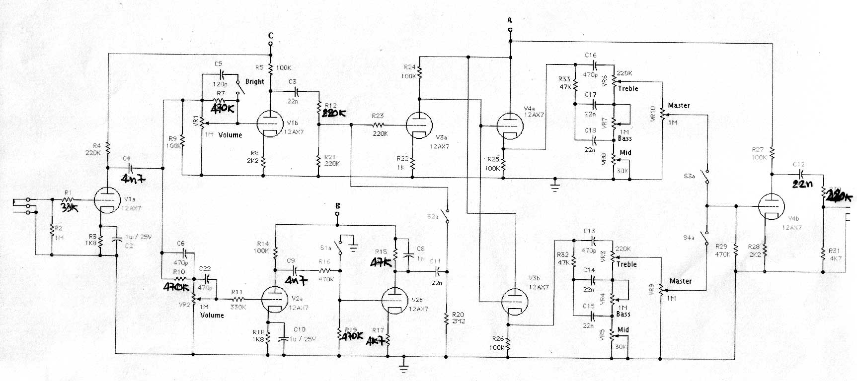 Aggiungo una ulteriore modifica al pre: il carico dell'ultimo stadio è passato da 100k a 470k con cap da 470n a 47n, così da non caricare troppo lo stadio e permettergli maggiore dinamica adattandolo al tempo stesso al finale (privato del pot del volume).