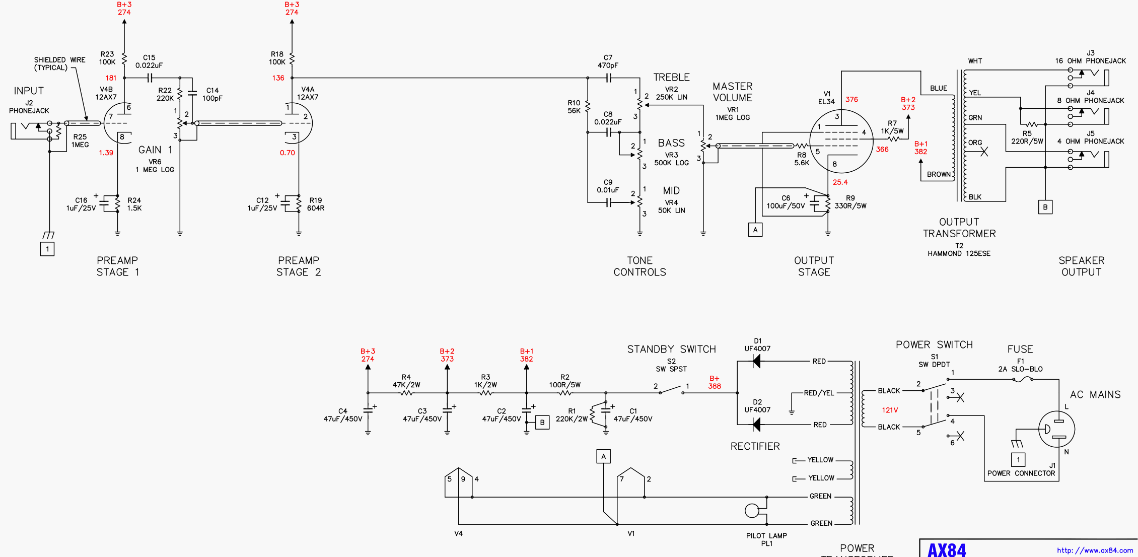 Il fatto e' che lo schema di base prevede una EL34, e un voltaggio all'anodo di 376VDC (stando alle letture dello schema).
