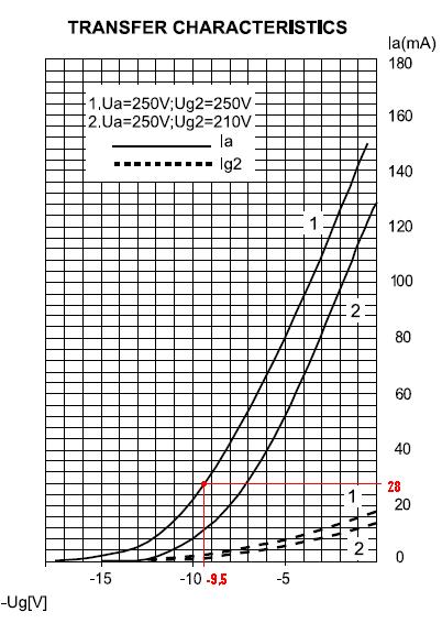 alimentando la valvola a 250V, mi calcolo la corrente Ia= 0,028A(28mA), ora dal grafico del datasheet, e utilizzando la curva 1(Va=250V e Vg2=250V) mi traccio le due rette e trovo una Vg1=-9.5V circa.