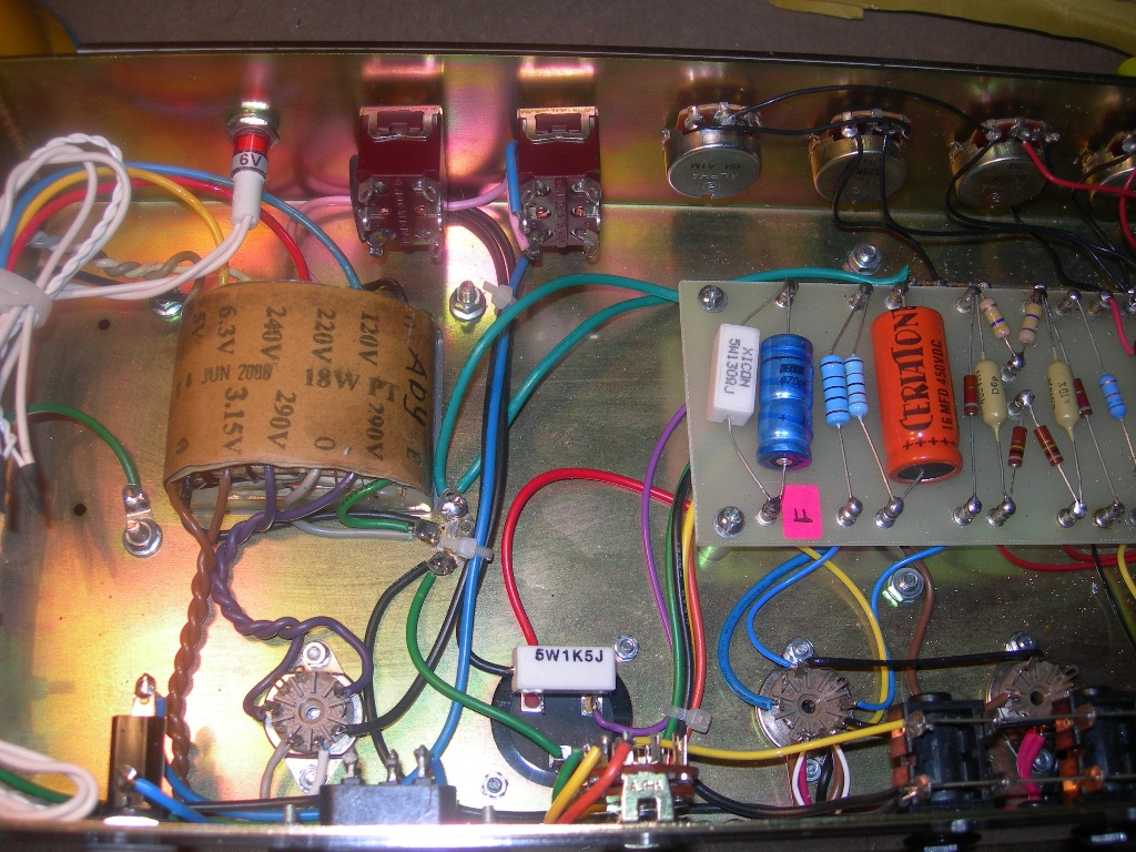 Ieri ho terminato la costruzione del Marshall 18watt TMB prendendo come base lo schema allegato. Devo dire innanzitutto che l'ampli suona molto bene ed è anche abbastanza silenzioso. Ho sostituito l'ultimo elettrolitico di alimentazione da 16u con uno da 22u, perche avevo disponibile quel valore li, ma non credo che ciò comporti nulla di particolare, credo.