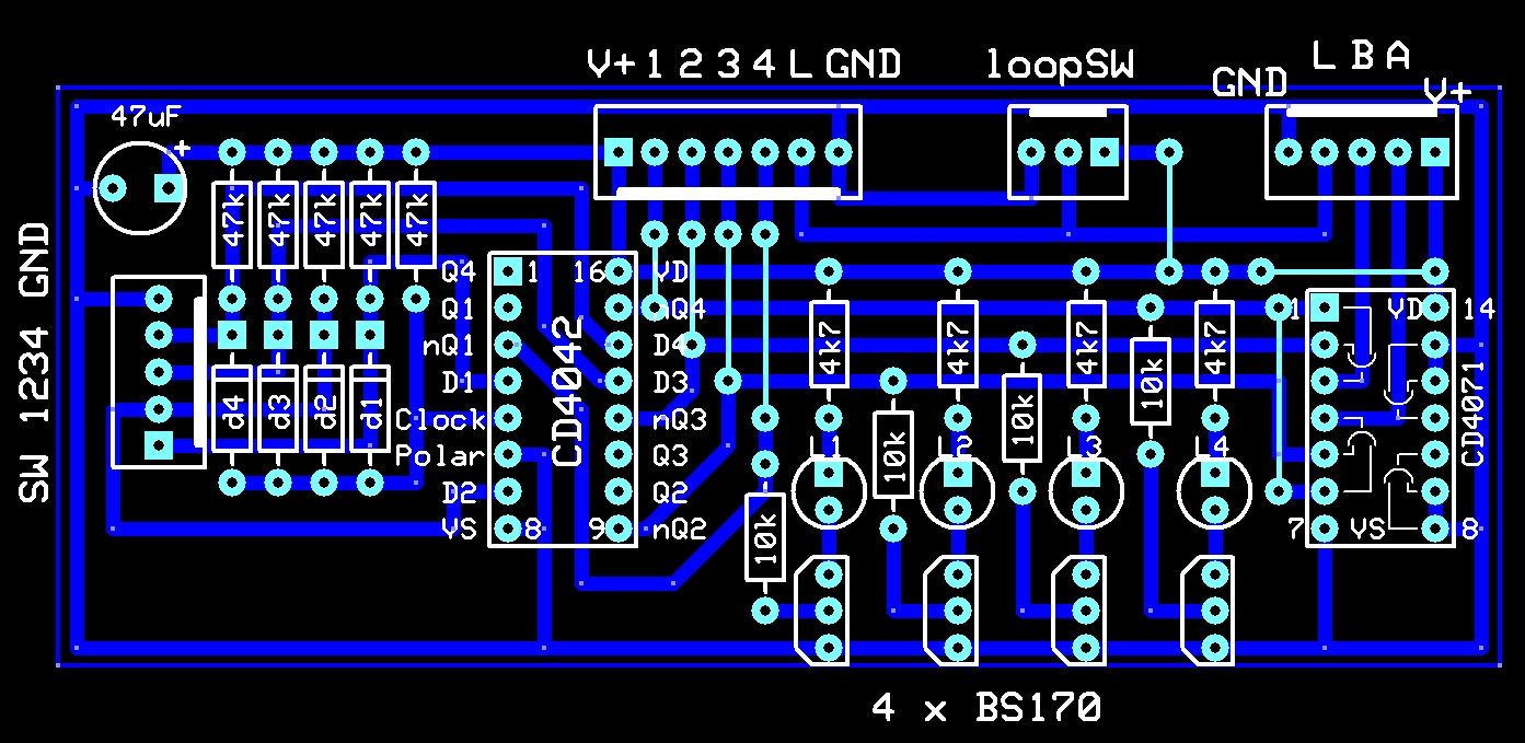 una PCB prevede 7 connessioni da portare all'ampli (V+, Ch1, Ch2, Ch3, Ch4, loop, GND ). il circuito è organizzato in modo