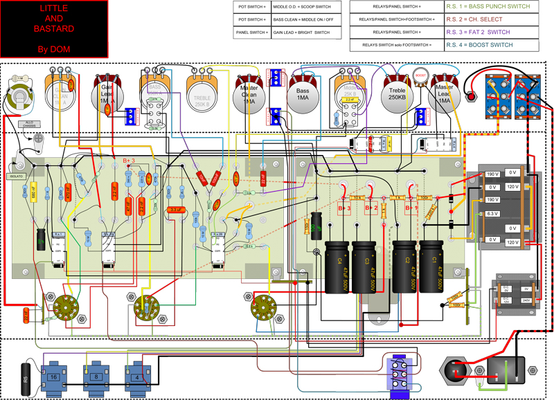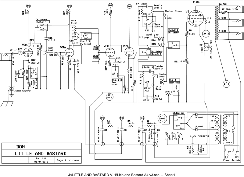 Su cosa mi sono basato? Bella domanda. All'inizio voleva essere un semplice monocanale stile AX84_Hi-Octane ( infatti se osservi bene l'alimentazione è pressochè identica ), poi mi sono detto: " ma perchè devo fare un clone di qualcosa ?" e ho cercato di realizzare qualcosa con le mie idee. Considerati i limiti di questo piccoletto sono riuscito a tirare fuori un bel Clean e un distorto veramente cattivo da selezionare indipendentemente ( anche se non sono 2 canali separati ).
