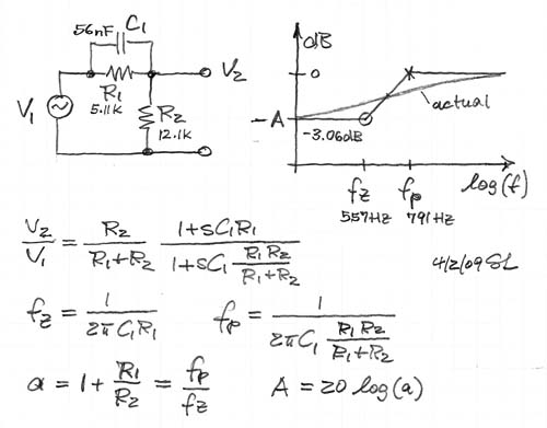 Per dimensionare il tutto si possono calcolare le frequenze di taglio dei due rami RC.