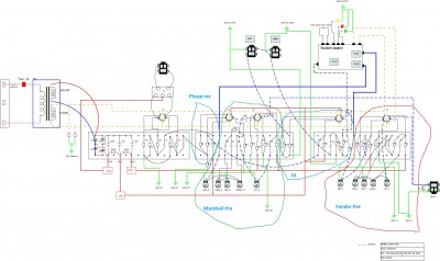 Le tensioni sono 350V di anodica per il PA ed a scalare con serie di resistenze puramente copiancollate dallo schema Fender, 340V per PI e FX-loop, 320V per i preamp.