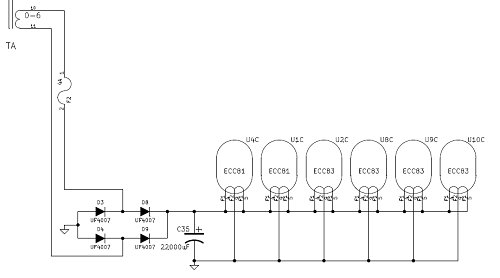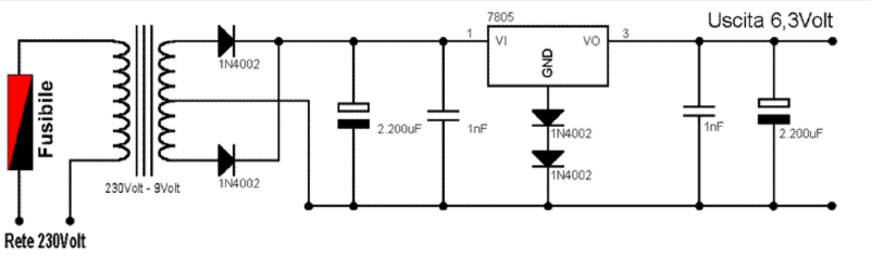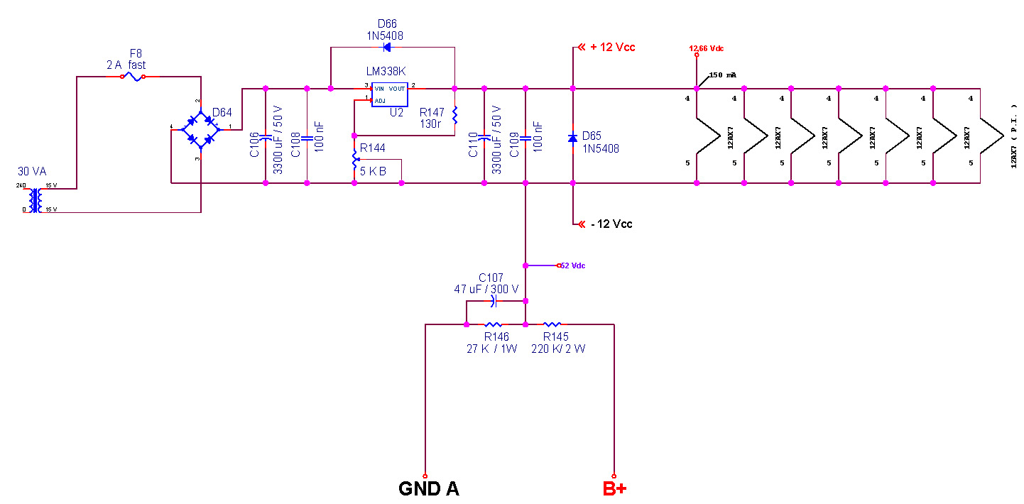 L'elevazione del circuito regolatore in DC è ancora più semplice di quelli in AC. Ovviamente non bisogna collegare il ramo negativo dell'alimentatore dei filamenti a NESSUNA massa.