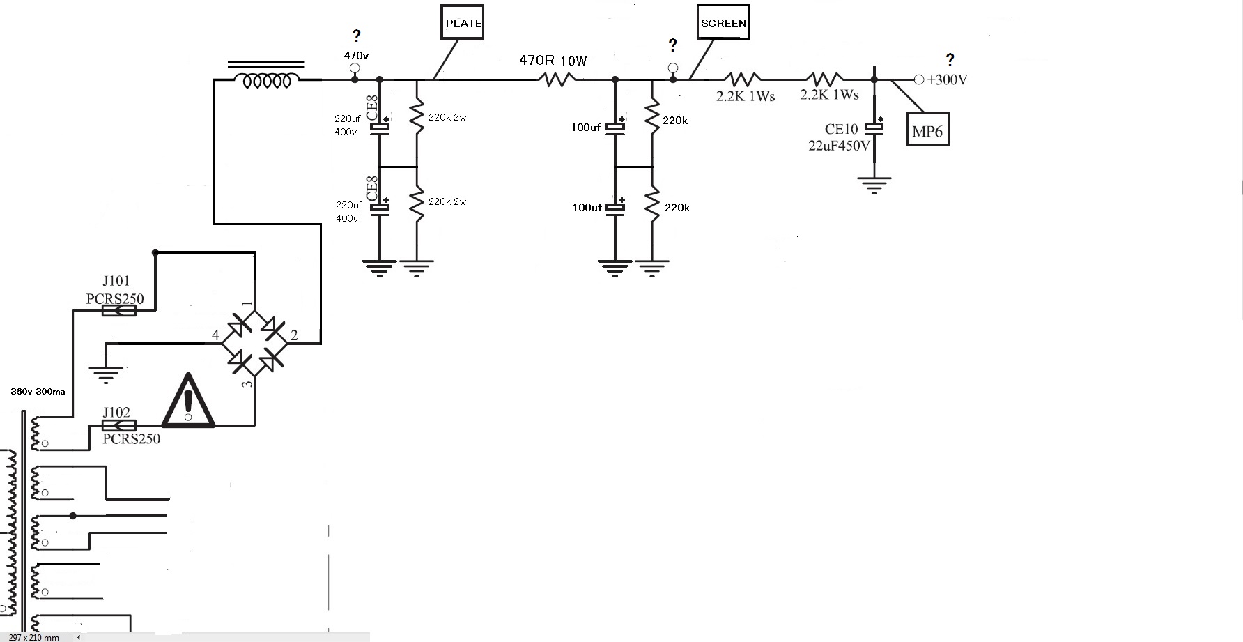 con AC 360v + 100v = 460v raddrizzando a ponte (quattro diodi, Full Wave con due diodi non si può) arriveresti ad un'anodica di circa 640V DC