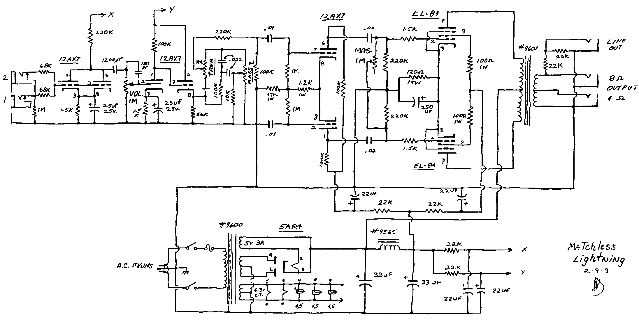 ad ogni modo, in uno schema dello spitfire http://www.schematicheaven.com/newamps/ ... itfire.pdf , che è molto simile a questo ampli segna le tensioni, e per esempio su V1, la 12ax7 in ingresso, ho testato con il multimetro e mi dava esattamente i valori riportati dallo schema, ovvero c.a. 329 sulla 22k e il cap e 150 di anodica.