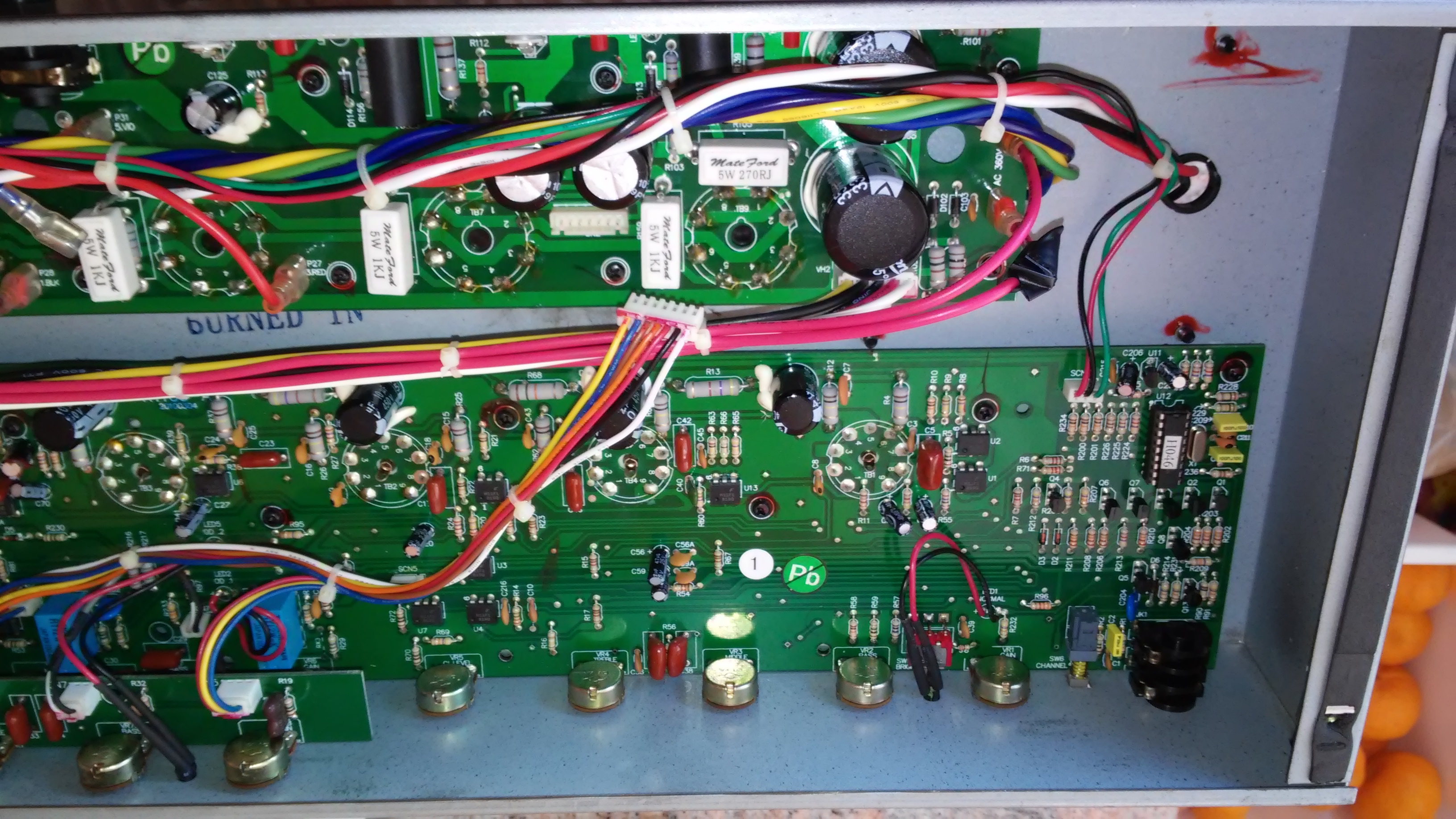 Poi dal trasformatore escono anche 3 fili di piccola sezione (2 blu e 1 bianco) che vanno in un connettore a tre pin sul circuito preamp. la misurazione fra un filo blu e quello bianco è di 27 Vac, stesso cosa fra l' altro filo blu e il bianco. la tensione invece misurata fra i due fili blu è 54Vac.