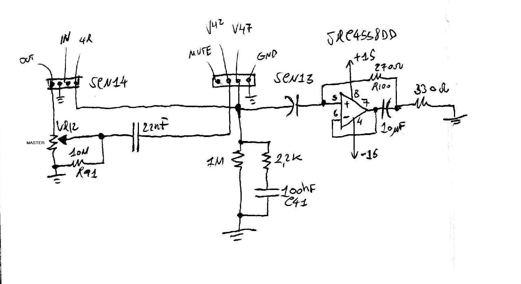 Visto che il preamp è stato provato e funziona correttamente, come suggeritomi, ho tracciato il collegamento dal return fino al finale, ovvero al connettore cn14, si nota subito dallo schema del pannelo posteriore, che il segnale dal preamp, viene prelevato dal morsetto in, e arriva infine all'out, diretto senza jack nel return, e dopo l'operazionale con il jack inserito nel return, ho dunque tracciato i collegamenti dal connettore cn14 fino al cn13 che va al phase inverter, il segnale out che arriva a v42 regolato dal potenziometro del master, è di facile intuizione,