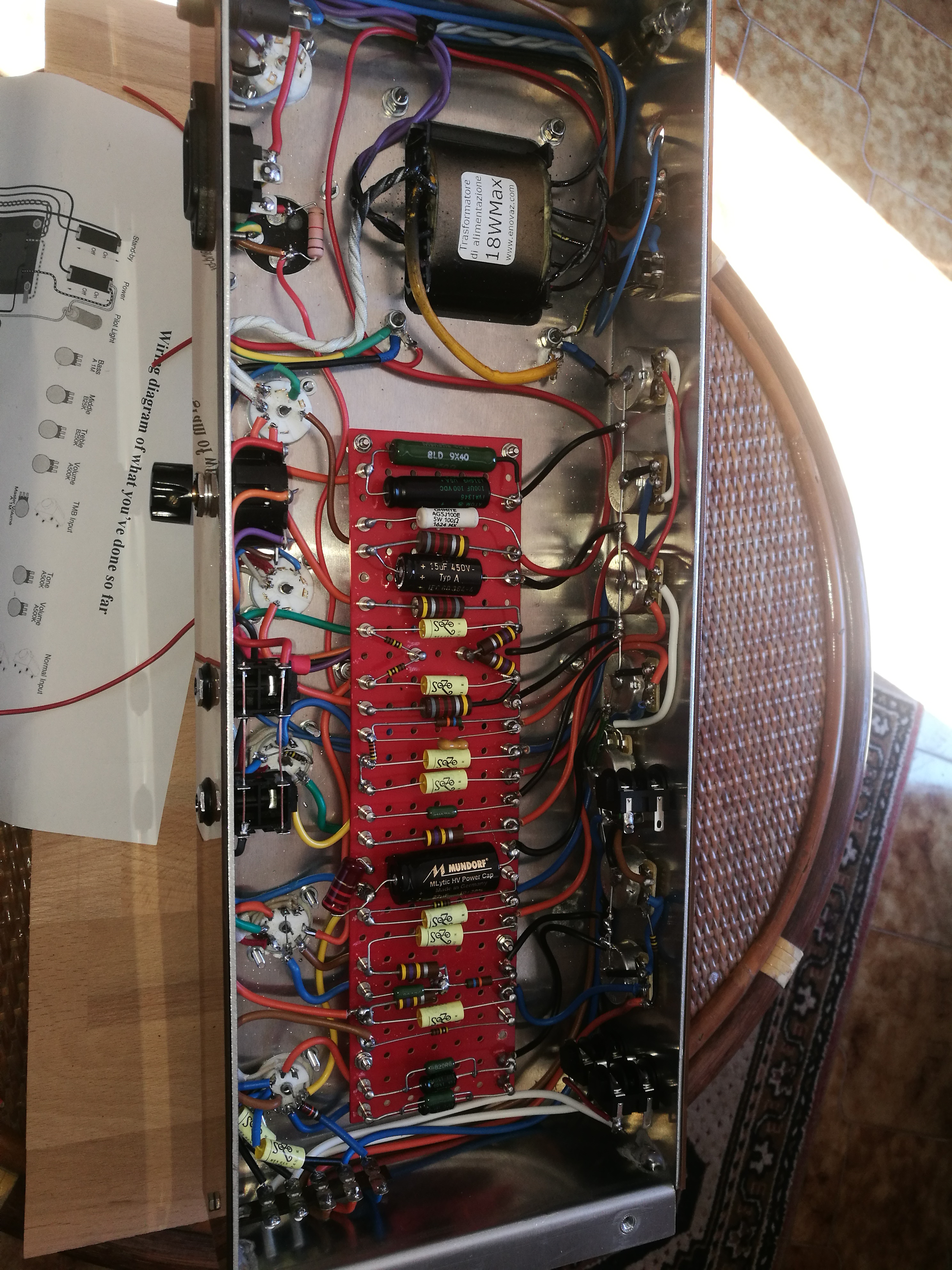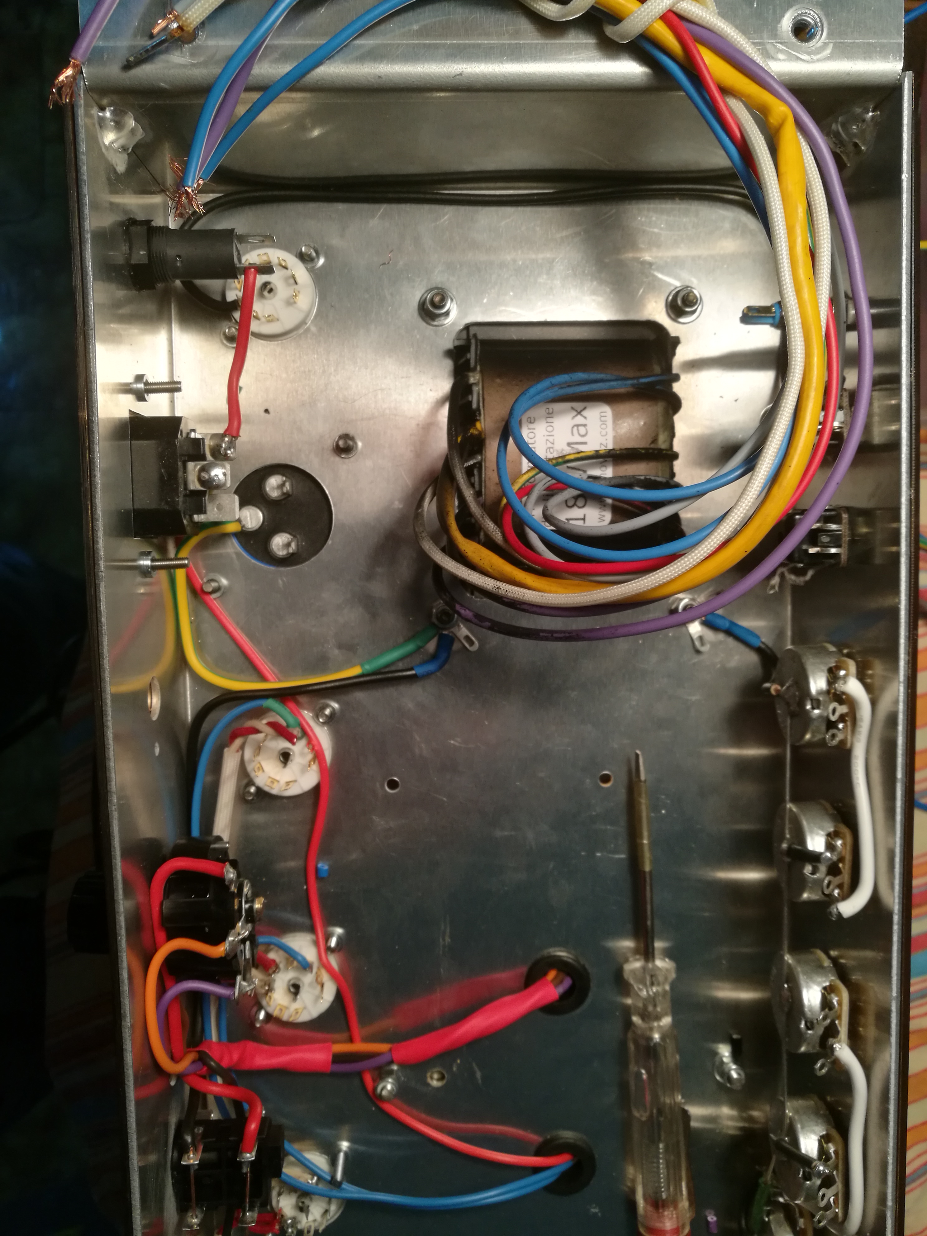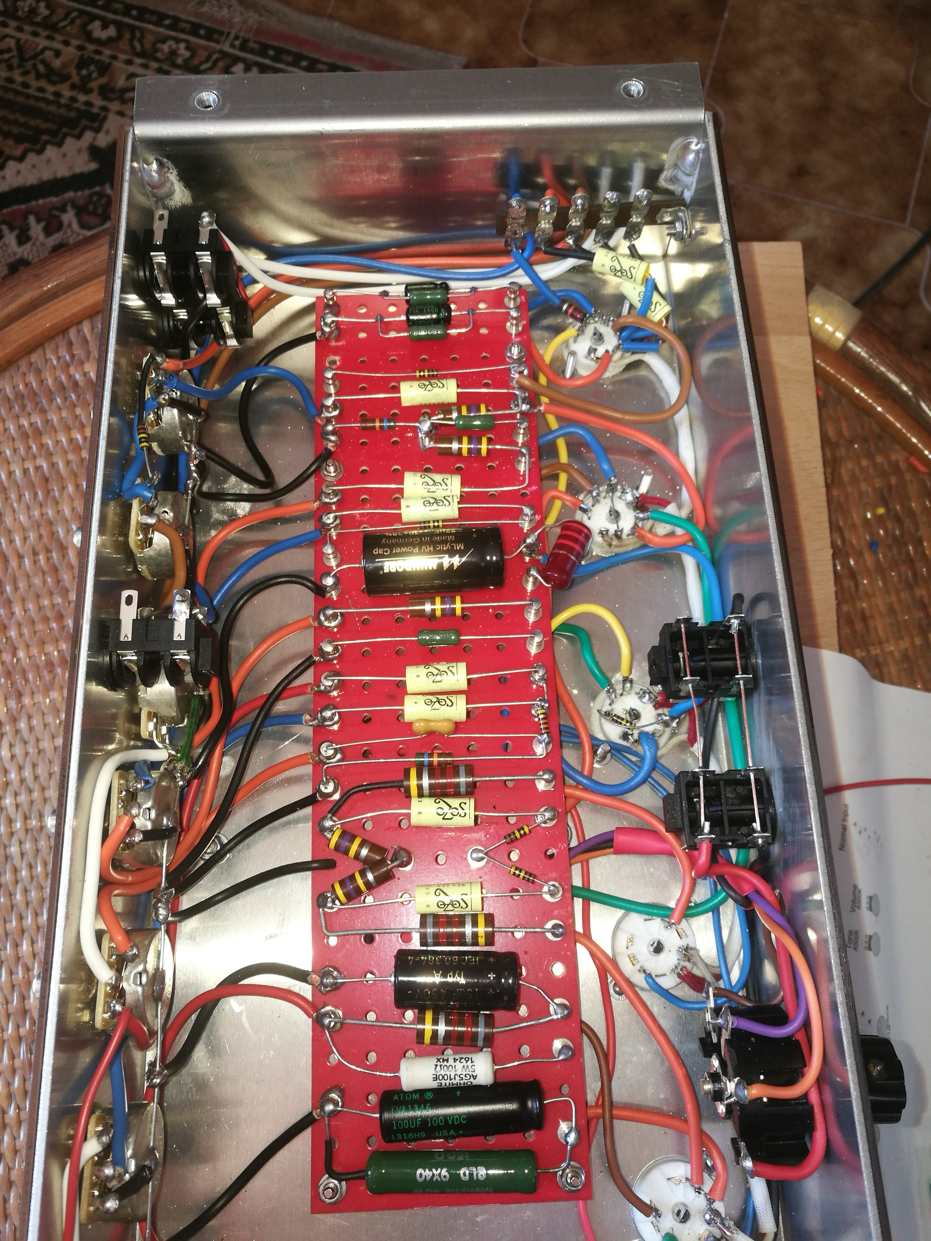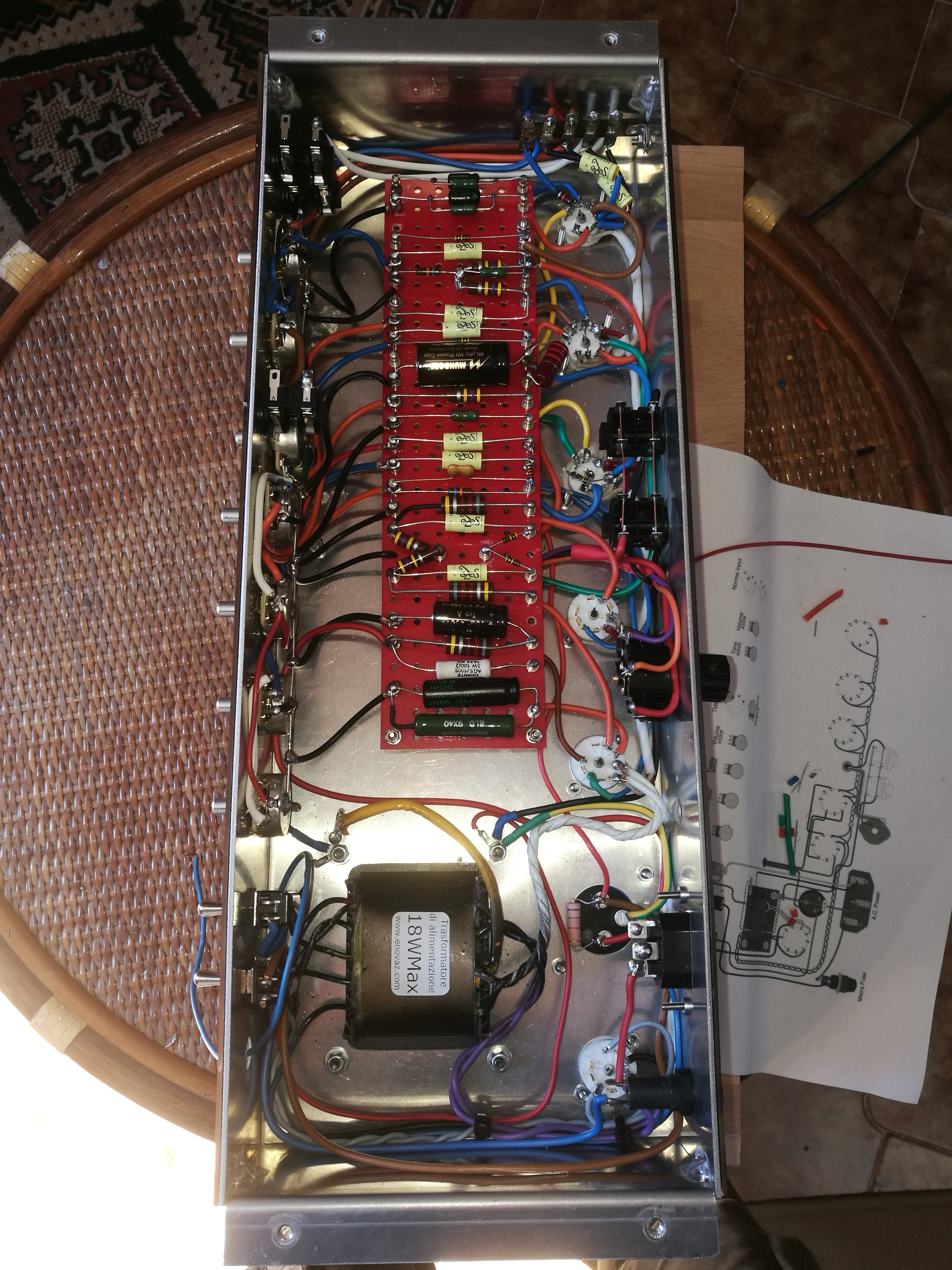 In foto mancano i collegamenti dell'alta tensione su v4, avevo dimenticato di ponticellare sul pin 3 e 9. L'ampli funziona benissimo, ho solo il problema di basso volume sul canale tmb. Ma ora mi sorge un dubbio: nello schema che ho seguito, il volume del tmb, prima di entrare nel pin 2 di v3, passa da una resistenza da 470k ohm. In altri schemi, tipo tubetown, invece no. Qual'è la sua funzione? Per le tensioni, aspetto che mi arrivi la finale. Ne ho distrutta una con uno sbalzo termico, purtroppo.