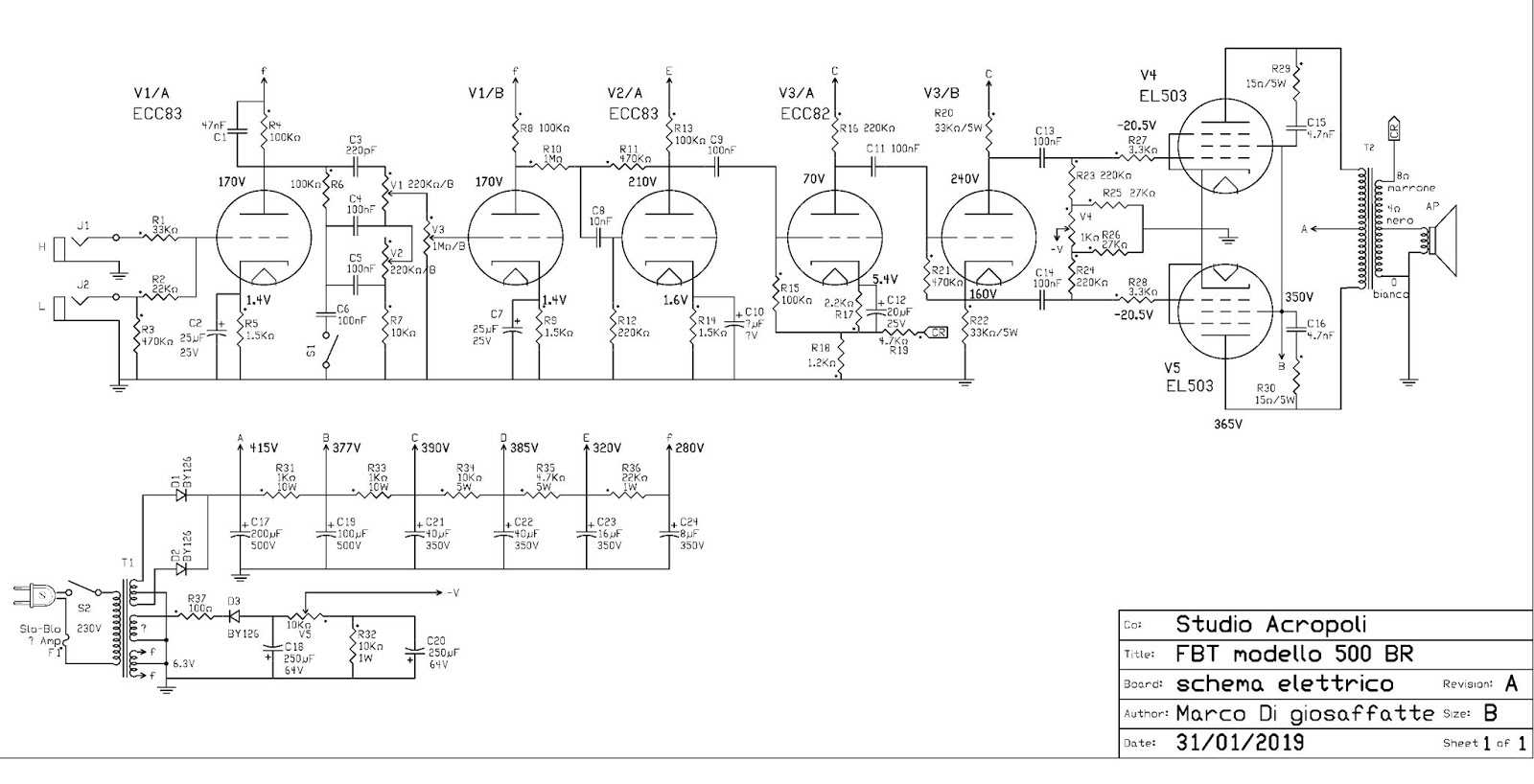 Sull'FBT 1200R ci sono 360V di anodica con -20V per il Bias ma sui catodi ci sono due resistori da 20R (su 4 finali), ne dedurrei che il 1200R non è un Fixed Bias ma un Mixed Bias, visto che per la configurazione Cathode Bias il resistore al catodo è da 56R (per due valvole con 275V di anodica)