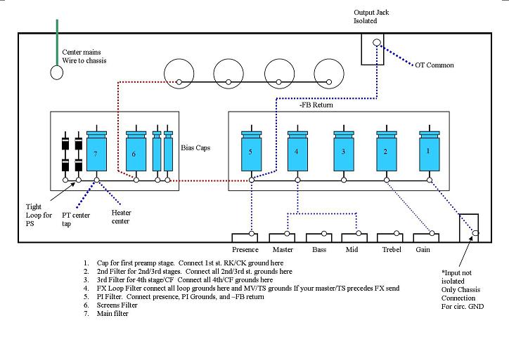 -Ogni altra parte di circuito, ad esempio il tonestack, va collegata alla massa dello stadio di guadagno da cui non è galvanicamente isolata(ricordo che l'isolamento galvanico si ottiene con i condensatori di disaccoppiamento)