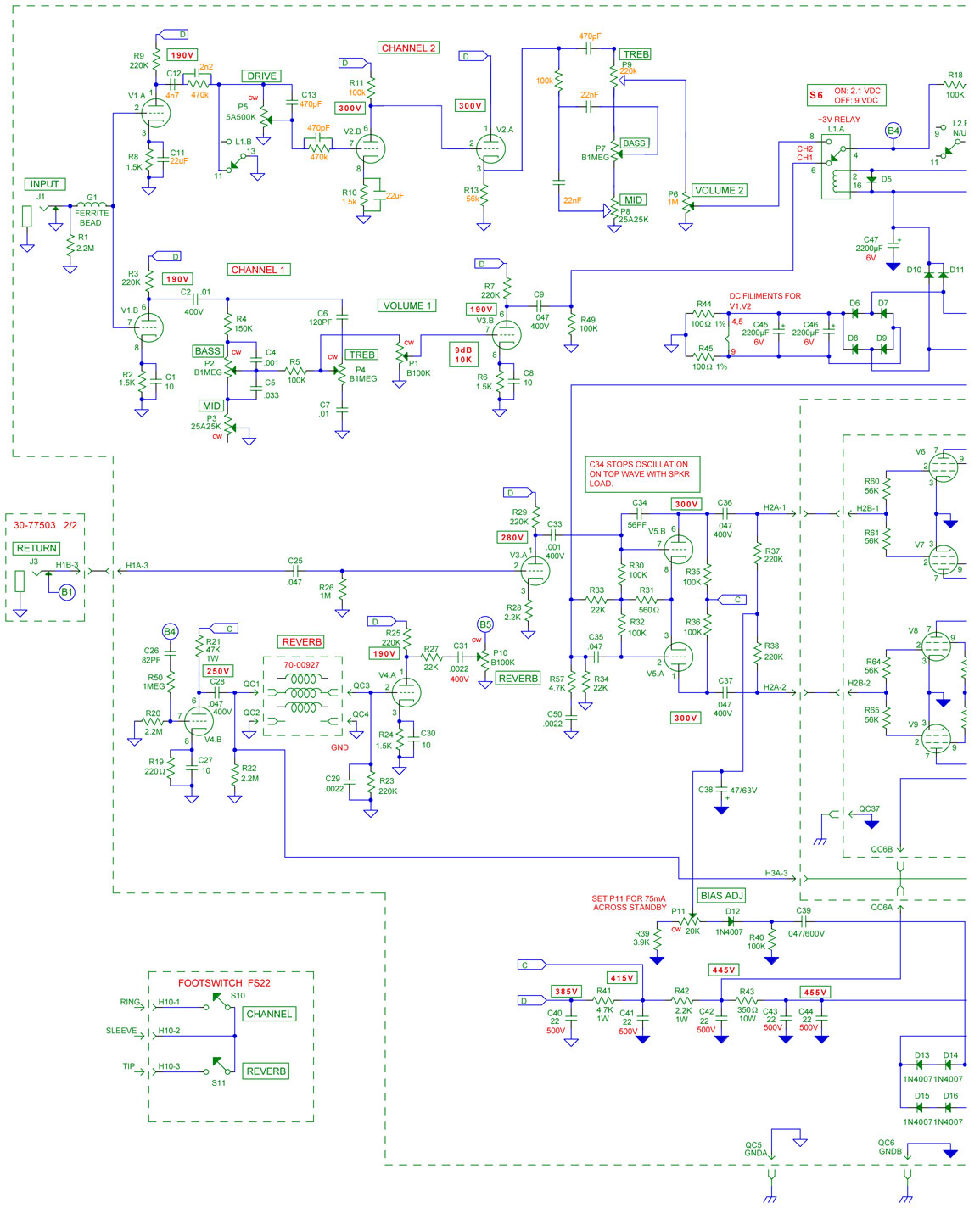 in pratica al canale 2 è stato ridotto il guadagno usando il terzo diodo come CF e quindi con guadagno <= 1 ed il secondo triodo ha una resistenza di placca da 100k, quindi minor guadagno del tubo, però la tensione è sempre sui 300v