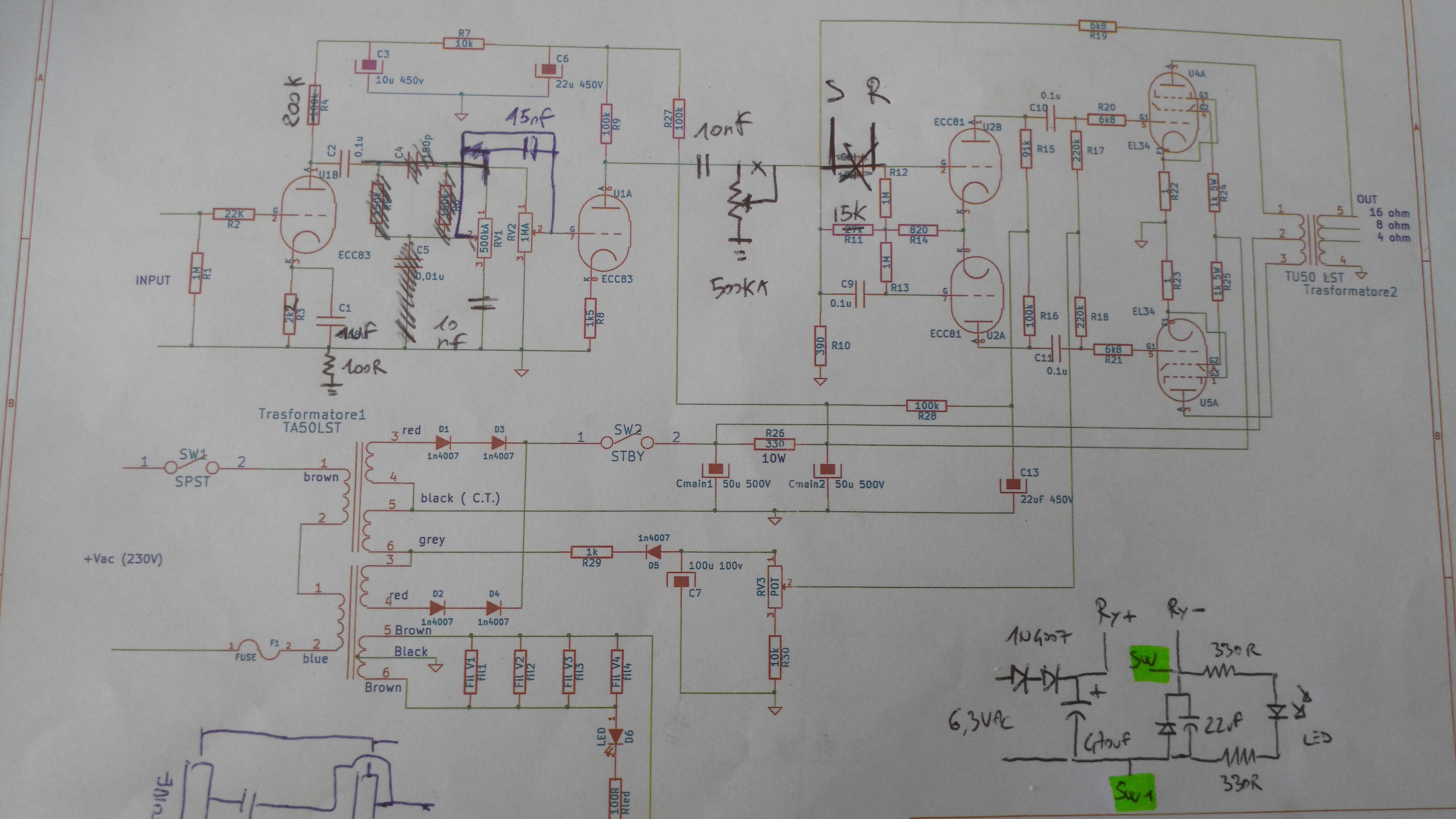 (In basso a dx a penna il circuito per raddrizzare i 6,3v per il relè da 6v)