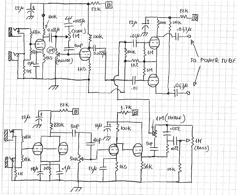come da oggetto, qualche anno fa avevo costruito questo bellissimo ampli, il pre del canale uno mi piace molto ed infatti e' quello che esclusivamente uso..l'altro canale (quello con la EF86) non risco proprio a farmelo piacere e in pratica non lo sfrutto mai...il suono mi sembra troppo medioso e agendo sul commutatore rotativo per selezionare il tipo di toni non sento profondi cambiamenti quindi stavo pensando di sostituire la EF86 con una 12AX7, rifacendo il circuito del pre..l'idea e' quella di 'scopiazzare quello del fender 5f2a che in precedenza avevo realizzato e che personalmente mi piaceva parecchio..vi posto lo schema originale e quello da me modificato.