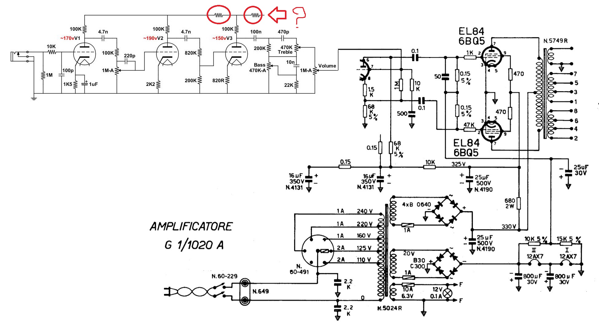 salve, avendo un geloso 1020 in buone condizioni vorrei anch'io apportare le modifiche indicate da Kagliostro. Non sono agilissimo nell'elettrotecnica e quindi vi faccio qualche domanda. quando si parla della necessità di sostituire i vecchi elettrolitici, si intende che TUTTI i vecchi condensatori devono essere tolti e messi nuovi? inoltre ho un'incomprensione nello schema elettrico delle modifiche da apportare, vedo cioè due resistenze che non riportano indicato il valore e non capisco dove vadano a collegarsi (presumo che la risposta possa essere banale, ma abbiate pazienza). allego lo schema con i dubbi indicati in rosso. grazie a chi potrà rispondermi.