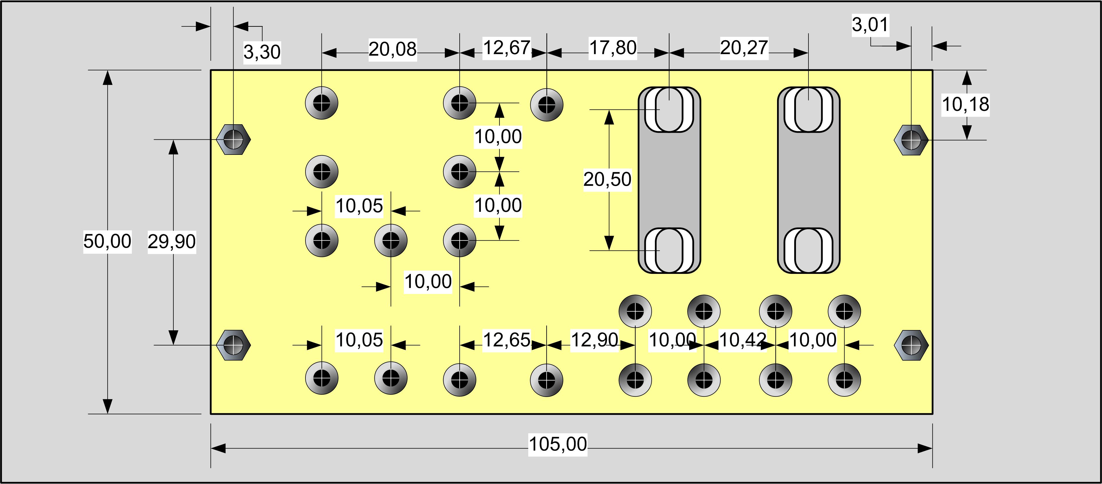 per quanto riguarda i due porta fusibili io ho riportato le misure di un articolo commerciale ma non so se sono identiche a quelle dei porta fusibili che hai recuperato, tienine conto per fare i fori