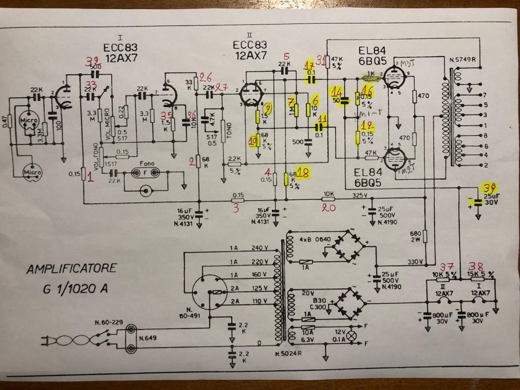 Mi serve anche sapere se (i componenti, non i pin) marcati 7 e 6 + cap da 500 e quello da 50 (numerato in rosso 14) ed il resistore di placca della PI da 68k (marcato 18) sono sulla Board o no