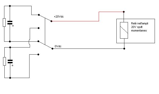 Userò un relè dpdt (a posto dello switch spdt) 9 o 12V (quindi alimentato a parte dall'esterno) in modo da avere due cap ed in parallelo ad ognuno metterò una resistenza dal valore appropriato, sicchè nelle due posizioni il cap attivo carica e l'inattivo scarica, così in entrambe le posizioni ho l'impulso necessario per far scattare il relè dell'ampli.