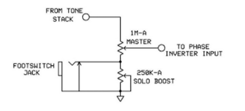 l'idea va bene (solo boost mesa mark V) solo che da 250KA se l'altro pot è sopra la metà non senti nulla. meglio 1MA