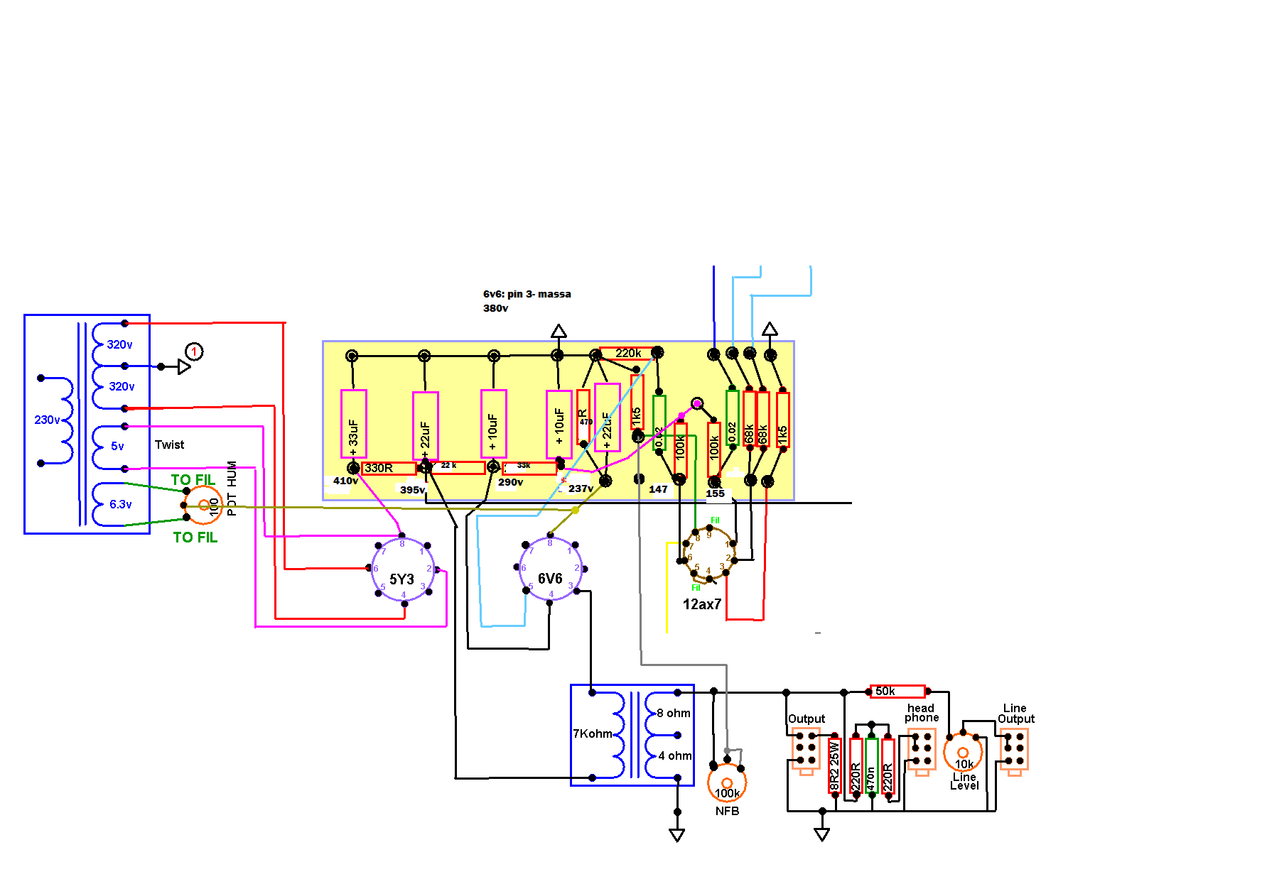 Quello che ho capito è che con il TA che hai la tensione sale troppo (rispetto il TA dei vecchi Champ) e quindi, per forza di cose, la placca della 6v6 non può essere collegata prima della prima resistenza del filtro, ma deve necessariamente essere collegata dopo