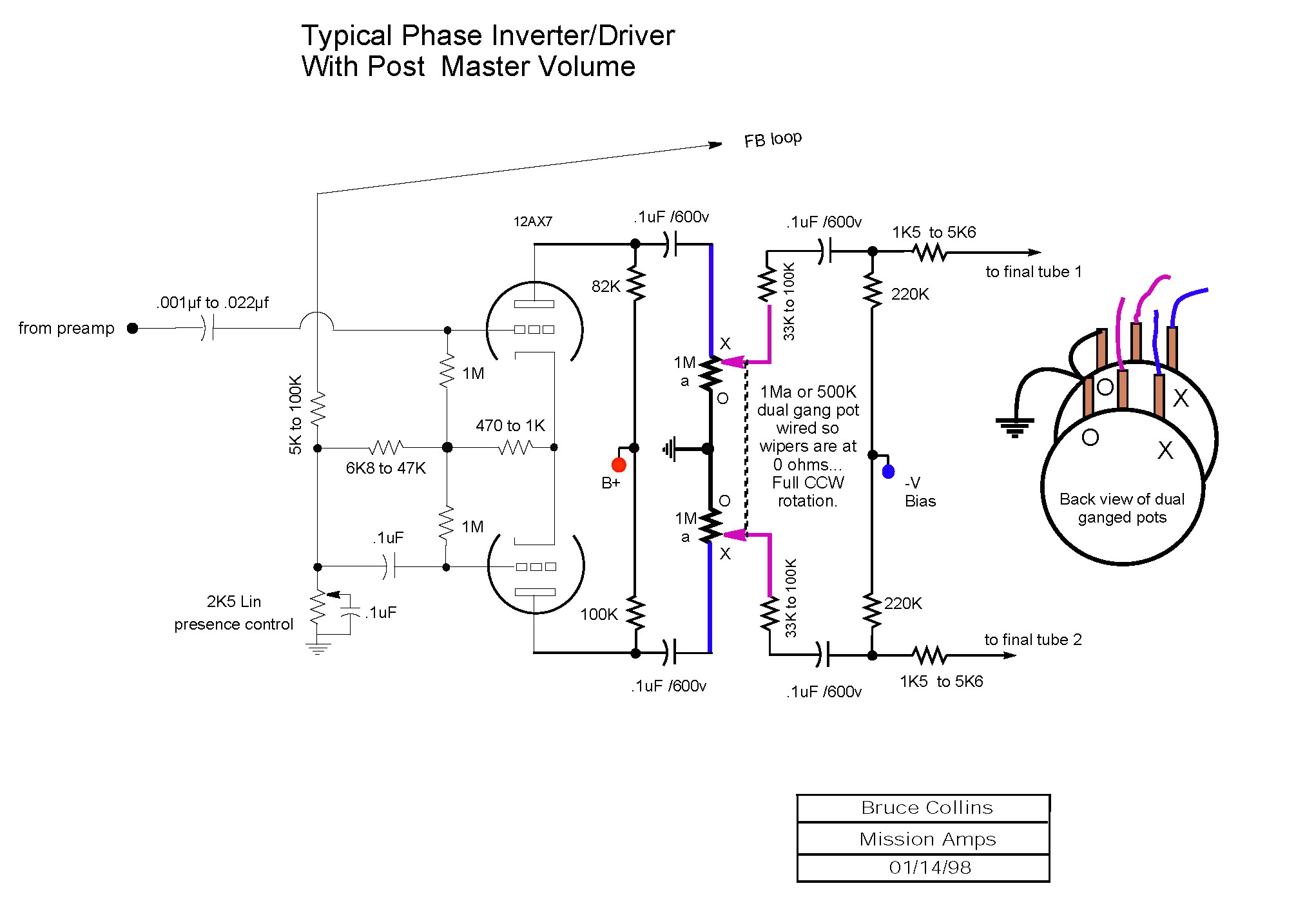 Non ho mai capito il senso di quel circuito, cioè il vantaggio che ha rispetto ad altri più semplici.Kagliostro ha scritto: ↑14/03/2023, 10:28In realtà una remora nei confronti del PPIMV di Weber c'è, per quanto ne so il tono in uscita si altera, mentre con le grid leak composte da pot la cosa non dovrebbe succedere