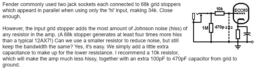 La res da 10k con il cap da 100pF sul primo triodo, taglia troppo poco. Se vuoi utilizzare l'espediente che abbiamo imparato dal buon Blencowe, avendo almeno lo stesso taglio di frequenze che permette la classica resistenza da 68k come grid stopper, allora ti conviene alzare il valore del cap tipo a 470 pF.