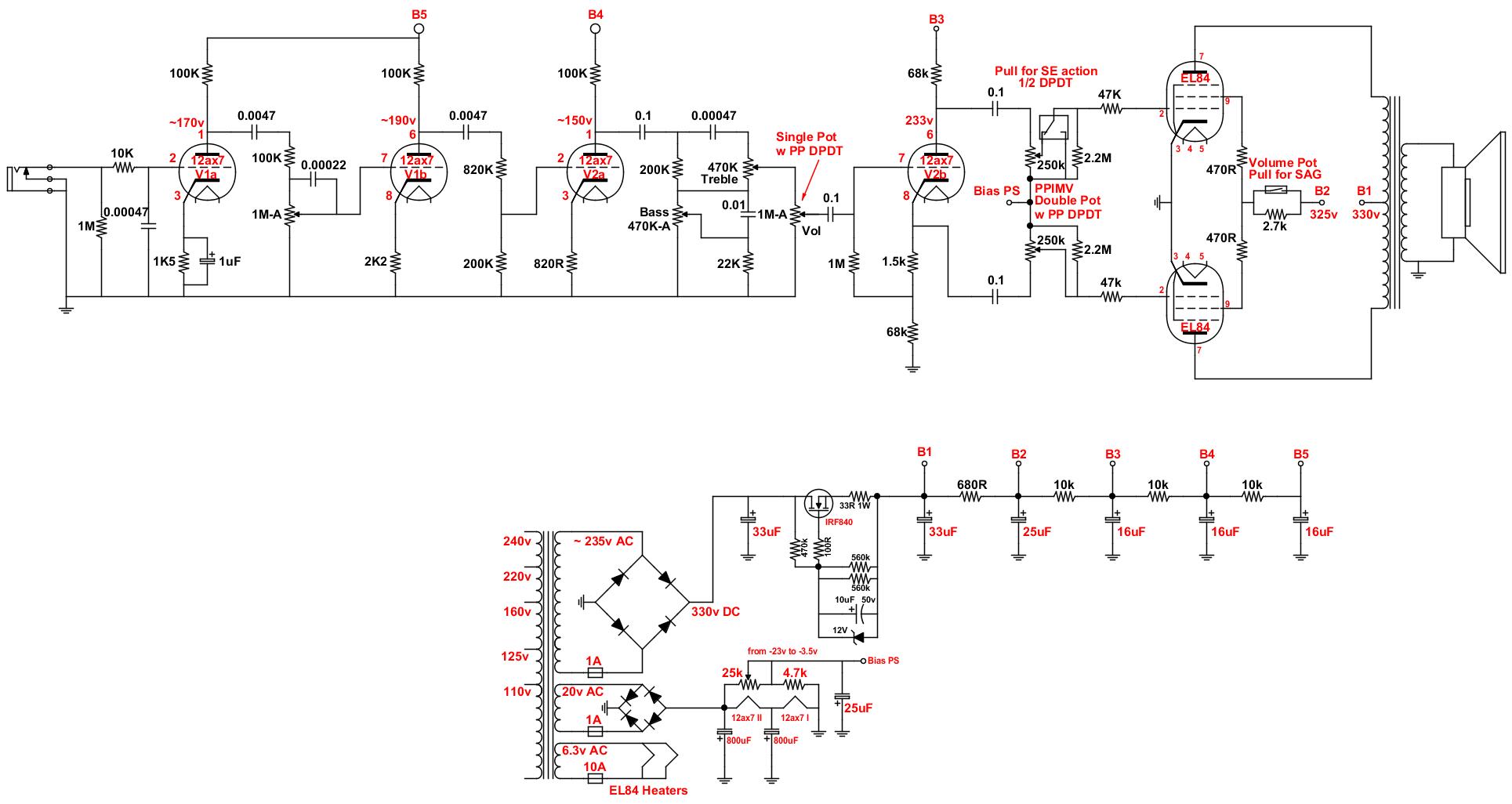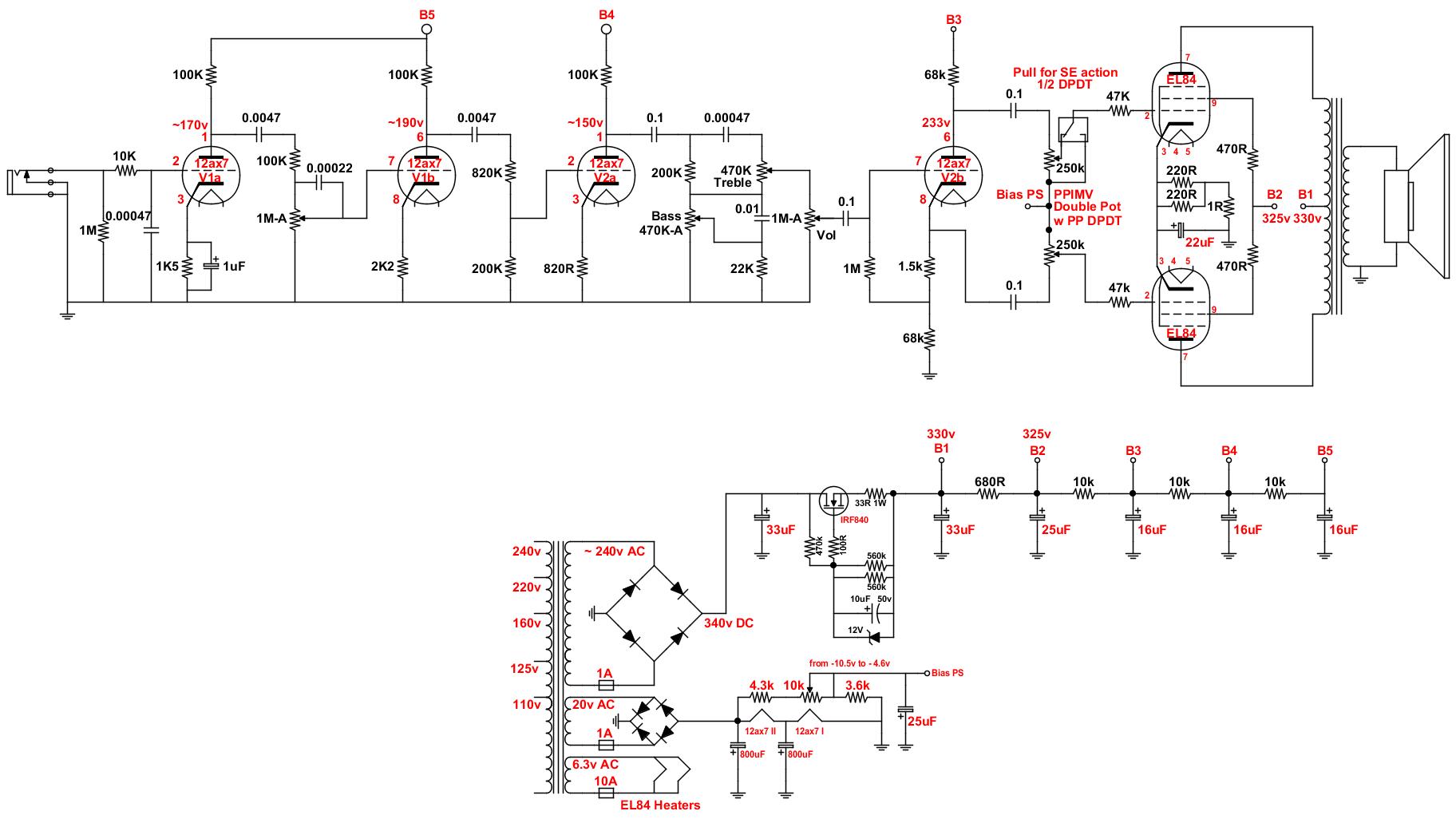 .. Le due resistenze da 2.2M che servono per assicurare la tensione di Bias d'emergenza, in caso il cursore perda contatto, se si passa al Mixed Bias direi si possono togliere, vedere alcuni schemi nel thread sugli ampli Mixed Bias che ho aperto, in caso di problemi a fornire un Bias ci pensa la resistenza al catodo