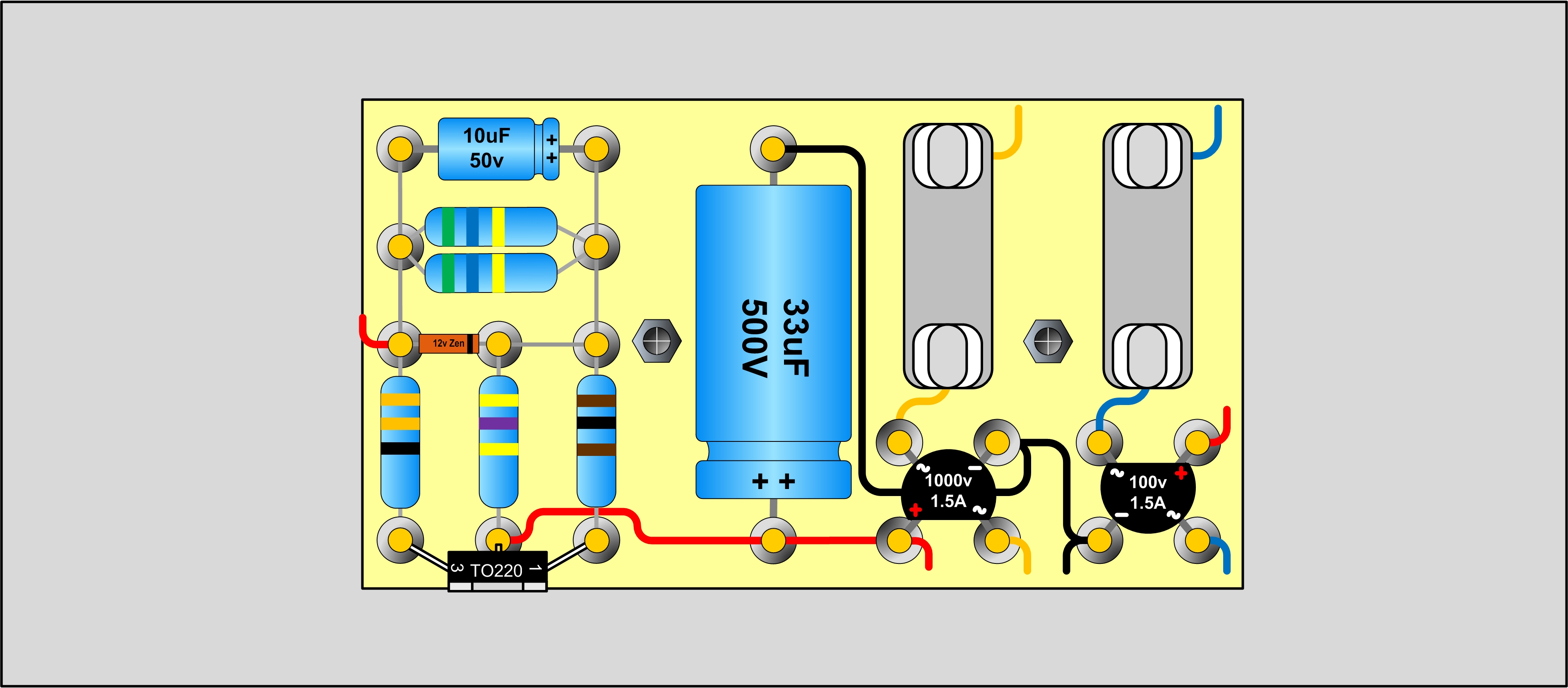 I ponti sono dei Vishay in contenitore WOG ma anche in contenitore D38 potrebbero andare, ho ipotizzato uno da 1000V (di solito si usano gli 1N4007) ed uno da 100V giusto per distinguerli, i prezzi sono allineati; manca probabilmente qualche dettaglio e di sicuro le diciture relative ai collegamenti, ma è tardi e per adesso termino qui