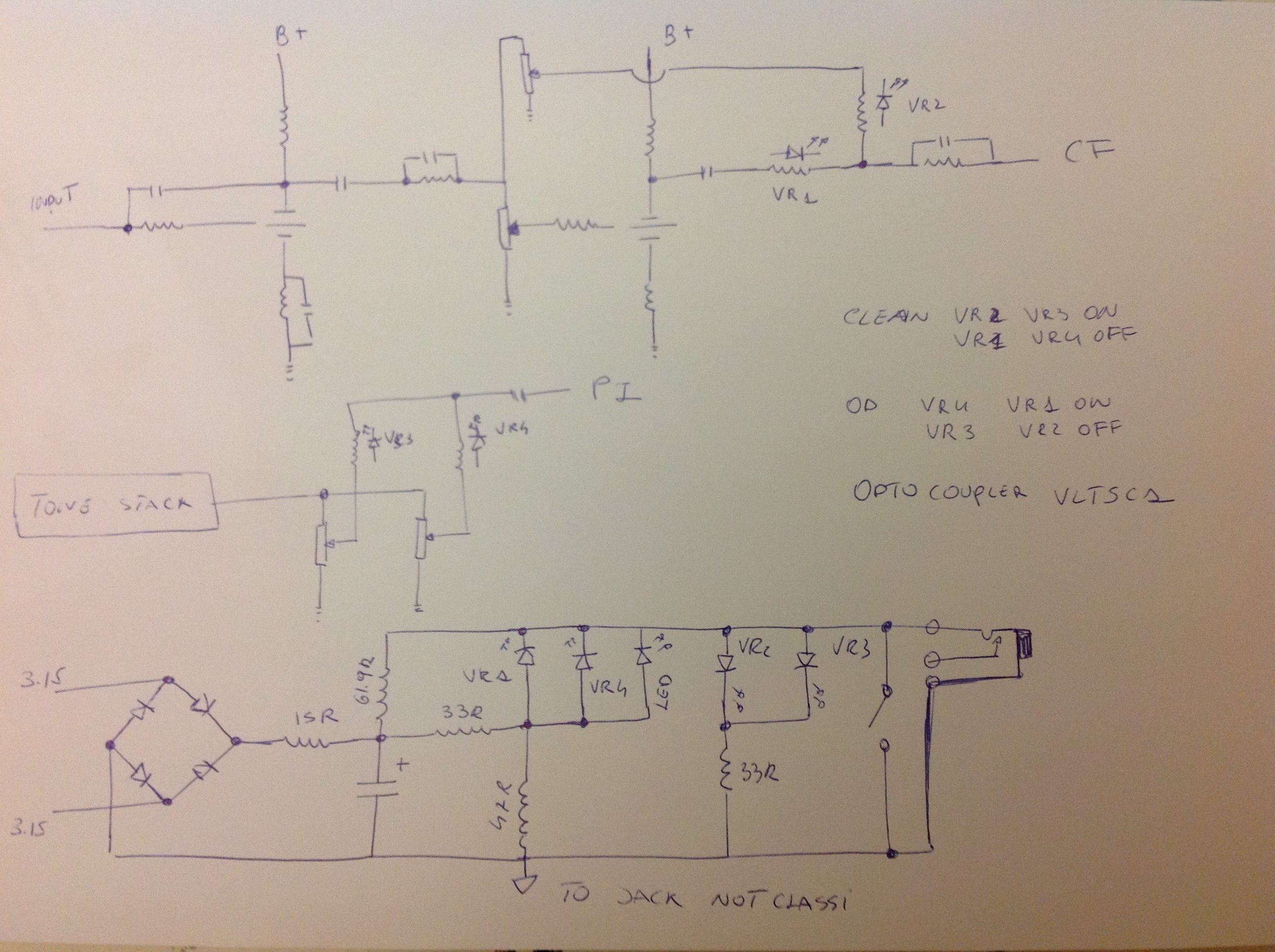 allora , ho cambiato un po il sistema di switch, almeno su carta, ho aggiunto una resistenza come riferimento a massa dopo c14, ho isolato anche il potenziometro del canale clean. ora non so se è necessaria una resistenza come riferimento sulla griglia di v2a( nella foto R1 con punto interrogativo).