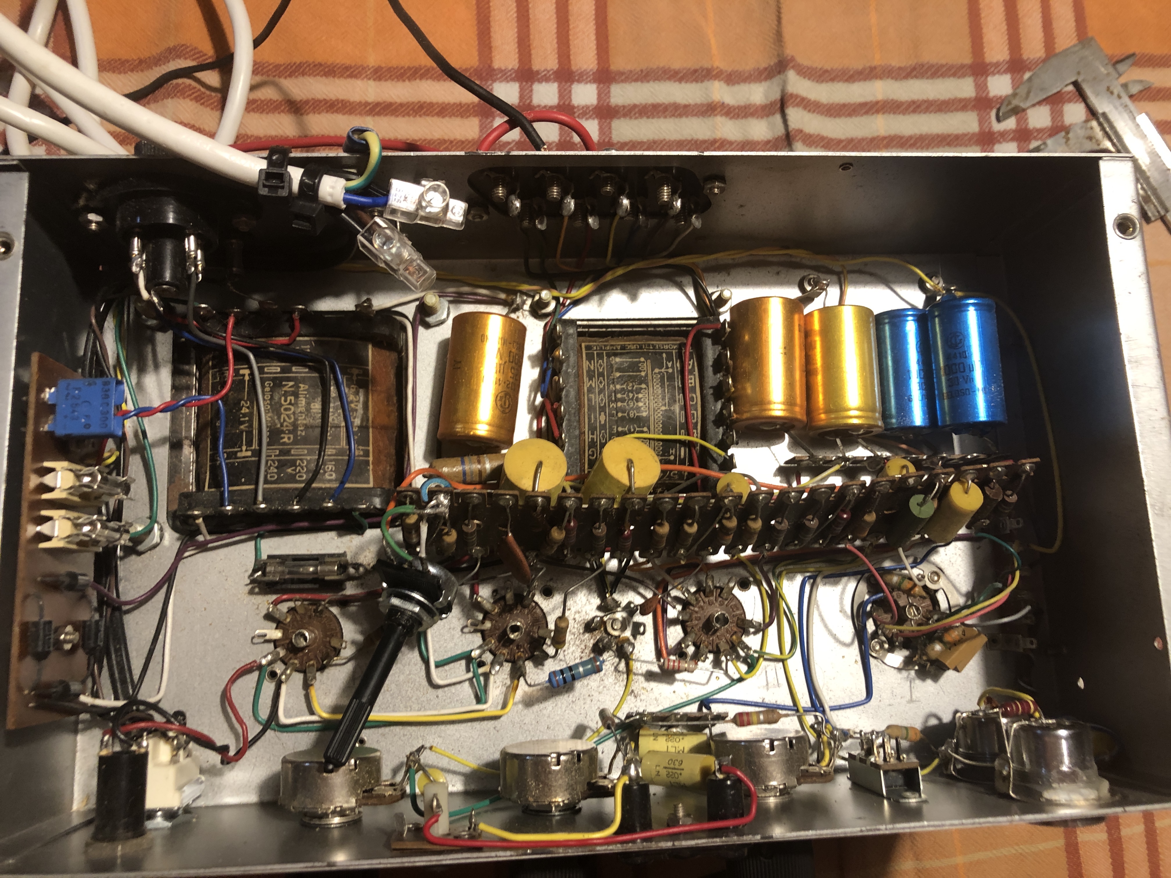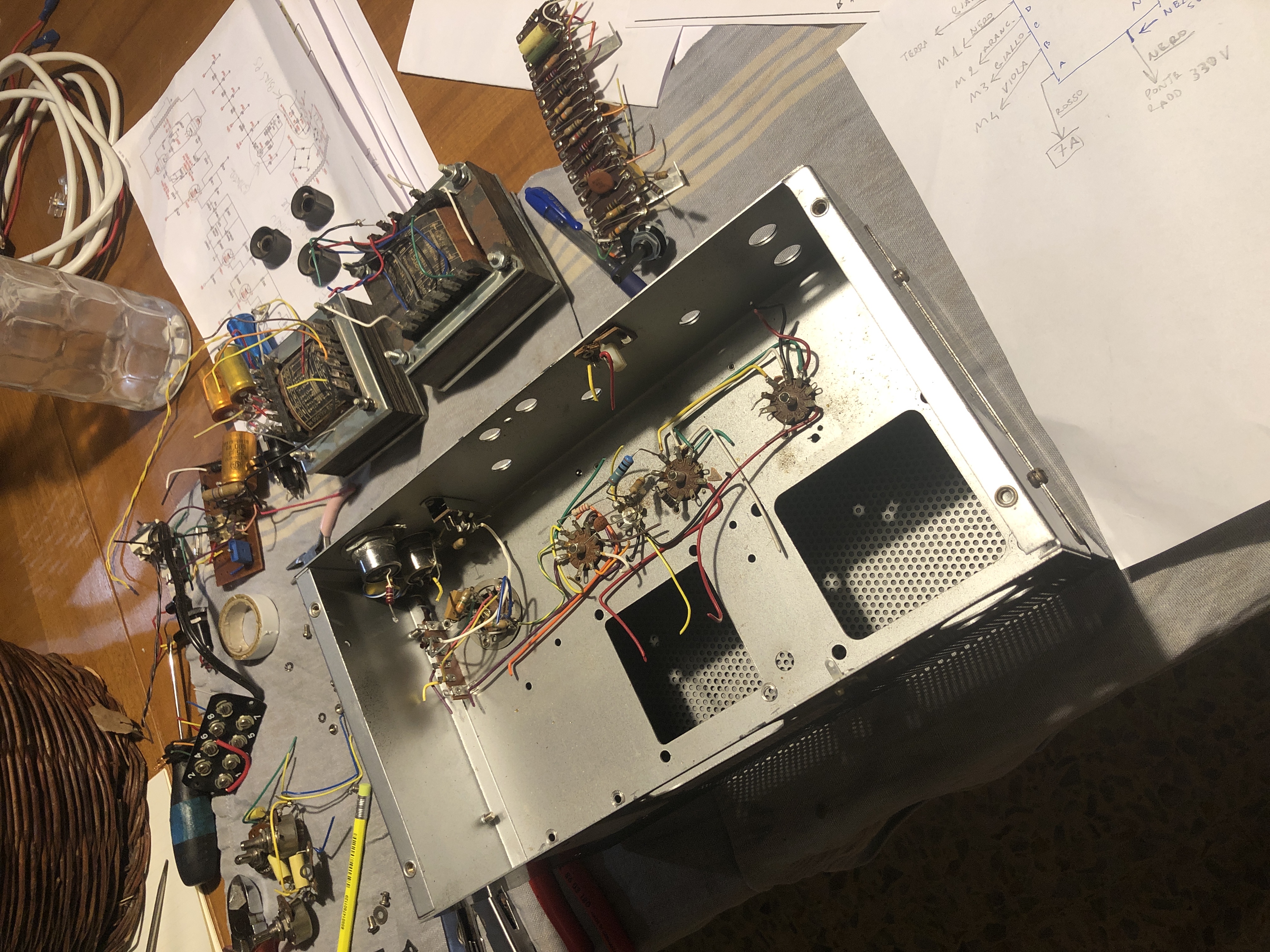 Sto pensando se a questo punto convenga smontare dallo chassis tutto il possibile ( dopo aver fotografato bene) per poi reiniziare a forare per per i nuovi componenti e poi a montare/ saldare le parti più in basso che sono più scomode, oppure conviene non smontare tutto bensì fare un settore per volta. Mi pare però che di vecchio rimangano solo i trasformatori e le basette delle valvole, tutto il resto se ne va, cablaggio compreso.
