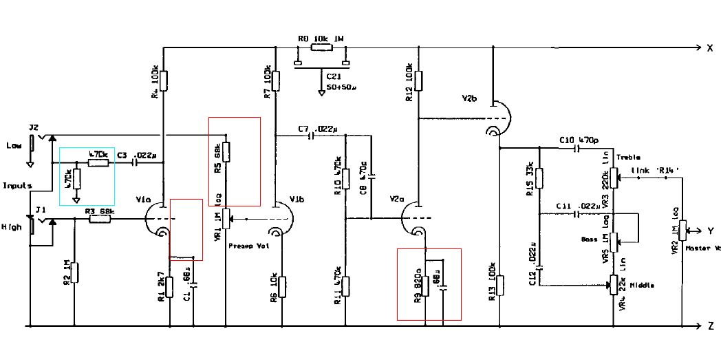 il 470p l'ho tolto inquanto togliendo la 470k diveniva inutile... ora suona paurosamente bene.. sia il canale LOW che grazie al bypass su V2 (il 680nani) risulta bello croccante rimanendo cmqe molto "tondo", un suono tutto fare per capirci... il canale HI suona anch'esso molto bene, buona distorsione.. buono il sustain (anche se sui marshal parlare di sustain è come parlare di vino in germania) ..poi dipende pure come si setta PRE e MV ..ciccia fuori un bell'overdrive anche dal canale LOW chiaramente