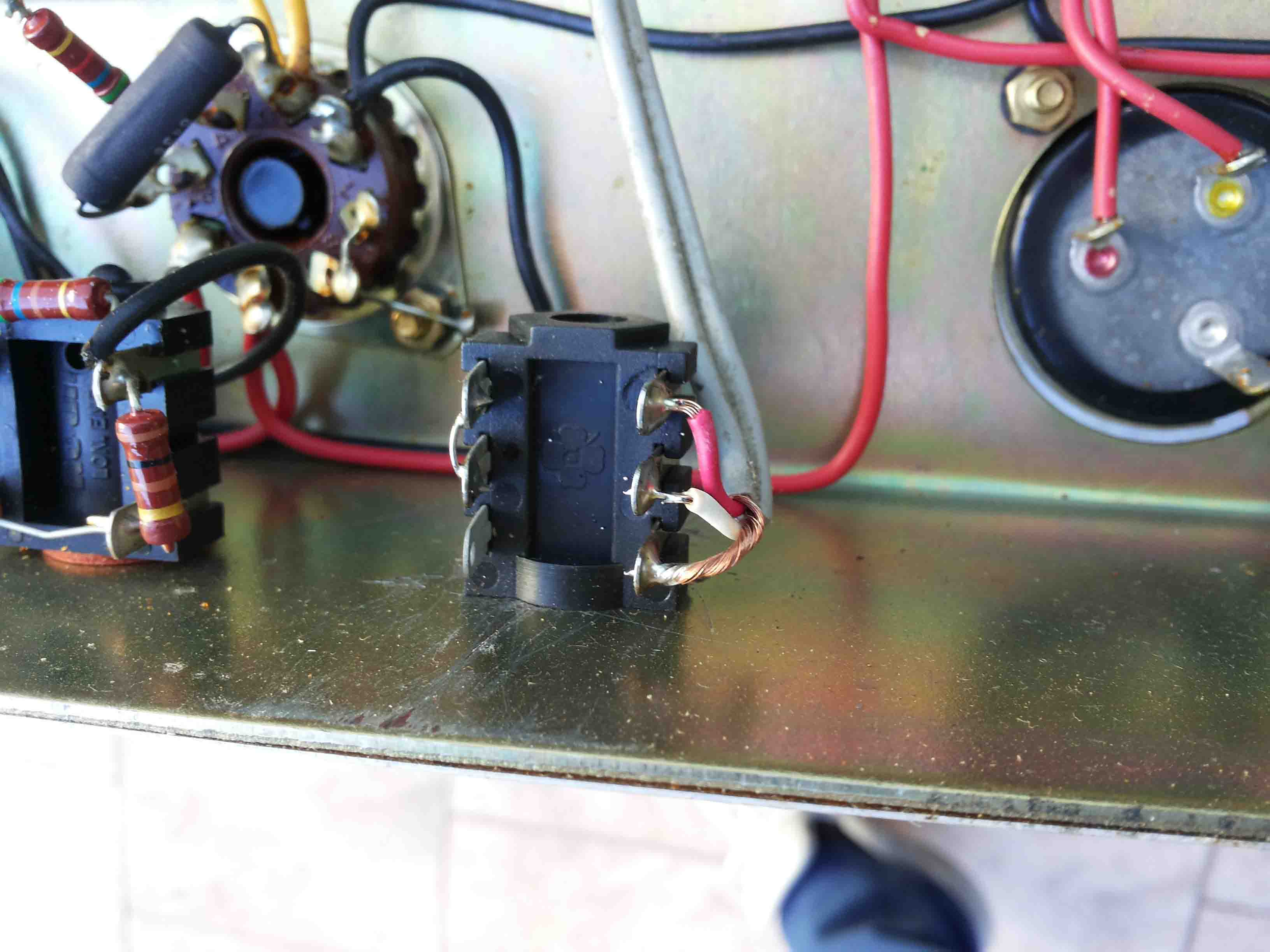 Cmq. il mio dubbio riguarda una modifica che è stata fatta aggiungendo una presa jack femmina stereo nel retro, l'ho smontato per vedere in cosa consisteva tale modifica e ho visto che c'è una coppia di fili grigi schermati che vanno a collegarsi ai reofori della resistenza R14, la resistenza R14 non c'è più, adesso io non saprei se in origine ci fosse stata o meno, cmq. i 2 collegamenti arrivano alla nuova presa jack stereo e risultano ponticellati (dalla foto si vede il ponticello nei 2 pin di sinistra della presa jack), inserendo un jack stereo naturalmente il ponticello viene scollegato, quindi non c'è più continuità tra i 2 fili e quindi anche sui reofori della R14.... e non so cosa succeda a questo punto perchè non ho provato !!!