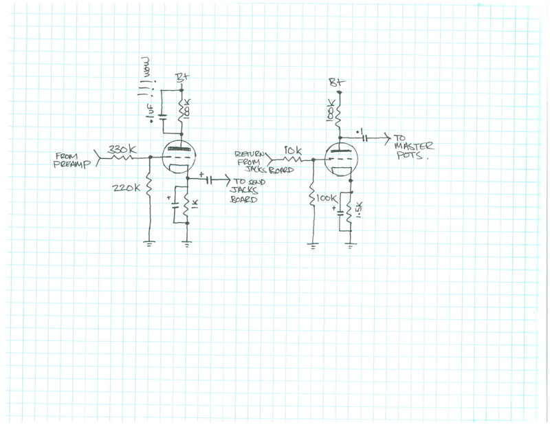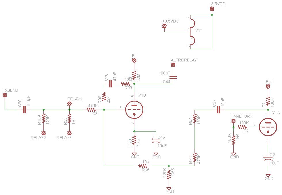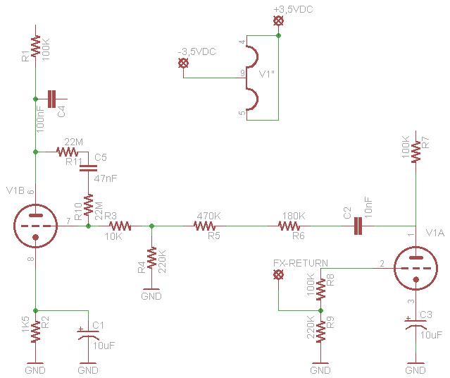 Ho smontato la scheda principale del pre e buttato giù lo schema della valvola che si occupa del loop. I S/R sono collegati alla scheda digitale. Dalla scheda esce un FX-SEND che va alla PCB del preamp, sulla quale la stessa linea viene indicata come FX-RETURN. Lo schema della valvola V4 che fa lavorare il loop è il seguente: