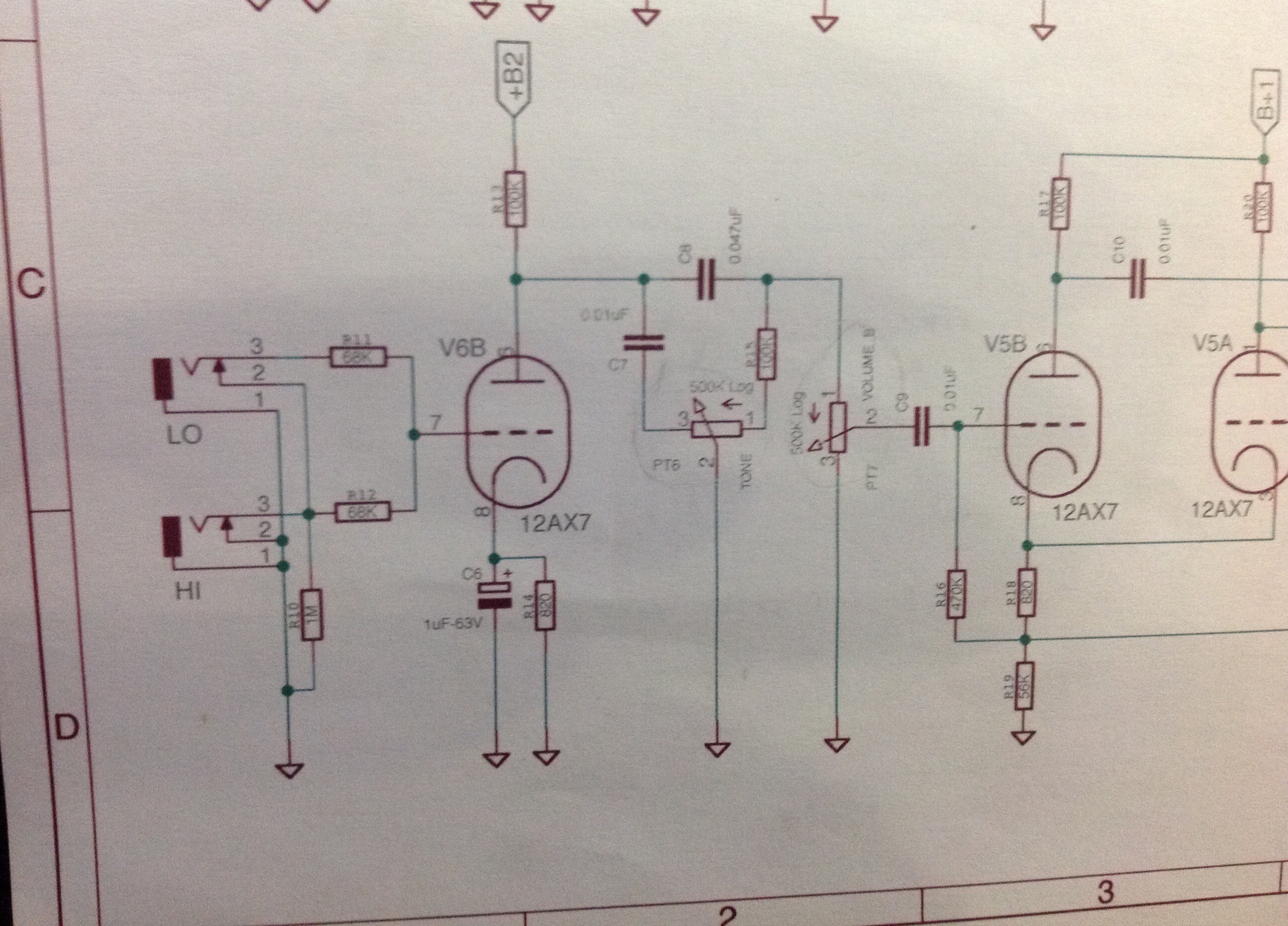 Salve ragazzi, ho una plexi18w tmb . Allora l'ampli a due canali, il primo con controlli eq gain e volume(ho apportato qualche modifica con il vostro aiuto), e il secondo canale con un controllo tono e volume. Ora avendo sistemato a dovere il canale tmb vorrei sistemare anche questo canale, cioe vorrei rendere quel canale clean, non dico un pulito fendere ma comunque un buon pulito. Vi metto lo schema della sezione preamp.
