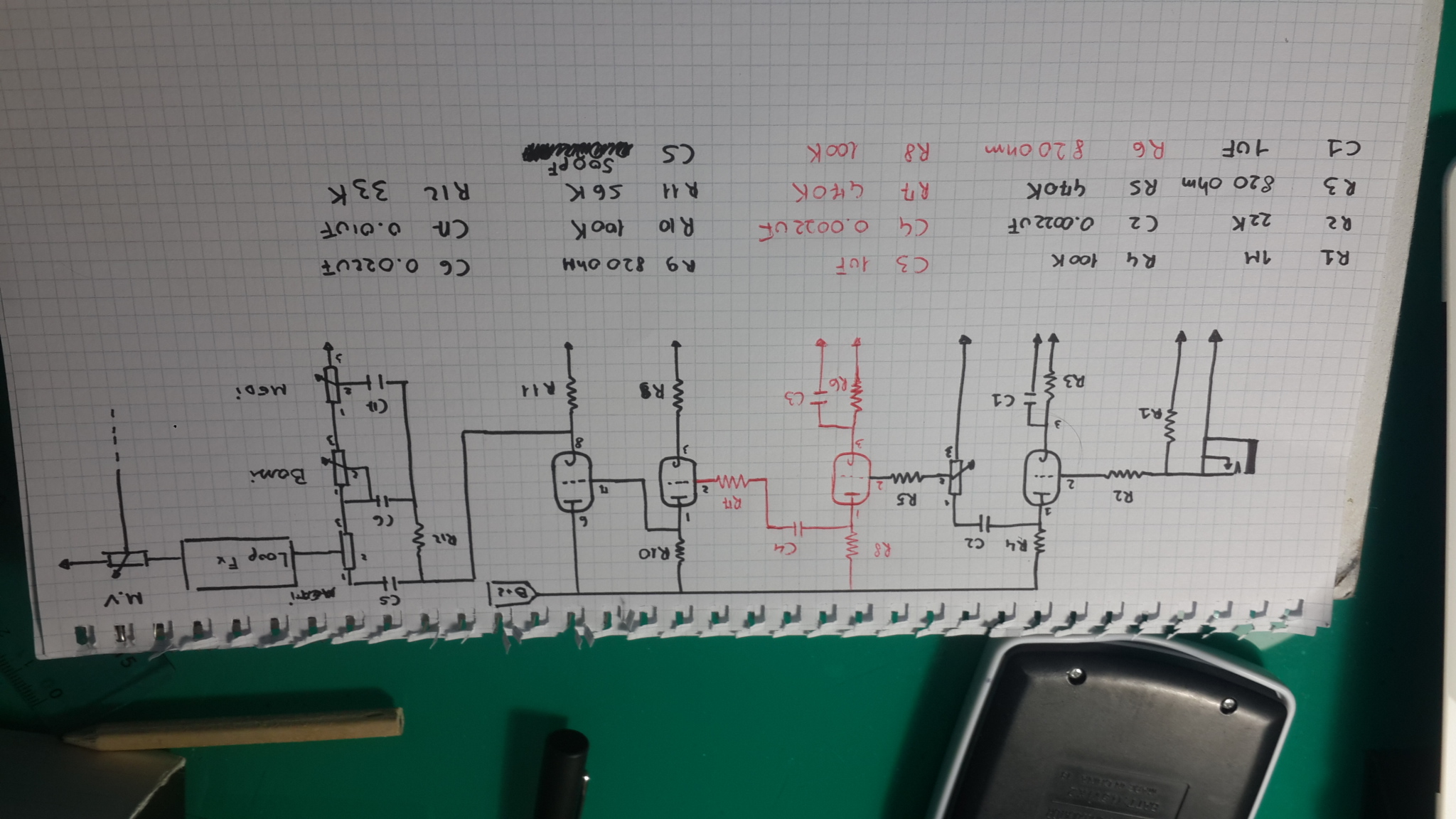 purtroppo non riesco comunque sia le resistenze anodiche sono tutte da 100k, per le catodiche le prime due sono da 820ohm e l'ultima da 56k, mentre la resistenza tra il primo e il secondo triodo 470k.