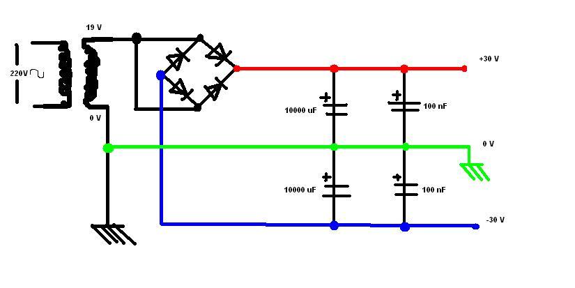 nella parte dell'alimentazione ho usato il classico schema: trafo primario 0-220V, secondario 0-19V; ponte raddrizzatore; filtro capacitivo (10000uF x ramo) in uscita ho +30V 0V -30V.... bene, praticamente ho seguito lo schema in galleria (http://www.diyitalia.eu/index.php?optio ... ey=1&hit=1) e con questo ho alimentato tutte e 2 le pcb con i rispettivi LM3886....