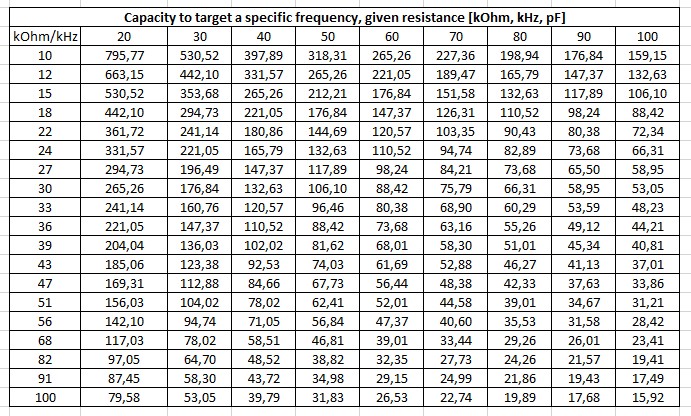 La prima é scegliere la riga corrispondente al resistore che hai scelto in kOhm e, incrociando riga e colonna, trovarti il valore del condensatore in pF nel corpo della tabella.