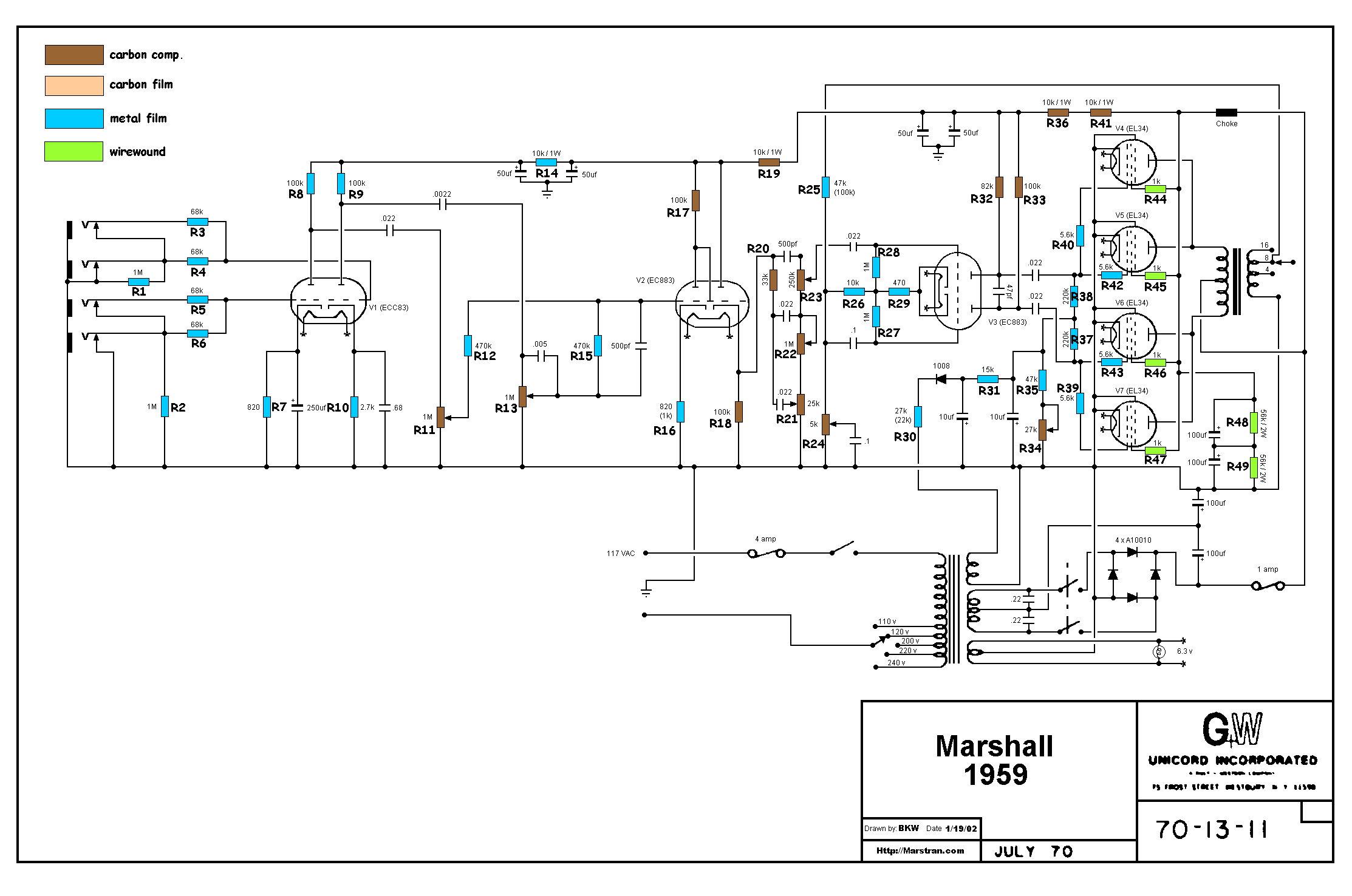 letto ciò ho preso uno schema classico plexi e ho annotato quelle che secondo me potrebbero essere le scelte tecniche per avere la "botte piena e la moglie ubriaca", ossia hiss tollerabile e pink noise a go-go (il cosiddetto mojo delle CC o magic che dir si voglia) attraverso la scelta oculata del tipo di resistenza da usare in base alla posizione che nello schema occupa, quindi in base ai voltaggi e ai livelli di segnale audio che la attraversano....