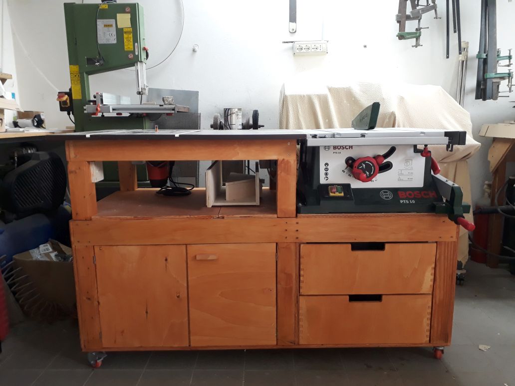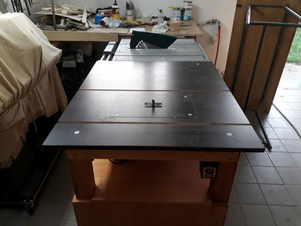 La parte sotto è un cassone in multistrato, adibito a mobile portaoggetti e appoggio per un banco sega bosch pt10. C'è poi una prolunga del piano del banco sega che fa da fresa da banco, con la classica a soluzione di montare a rovescio una fresa manuale. Con due binari guida sul piano e qualche accessorio autocostruito è moto utile. Il tutto su ruote con freno le poterlo spostare. Magari se ti interessa ti faccio due foto, in realtà è abbastanza semplice...