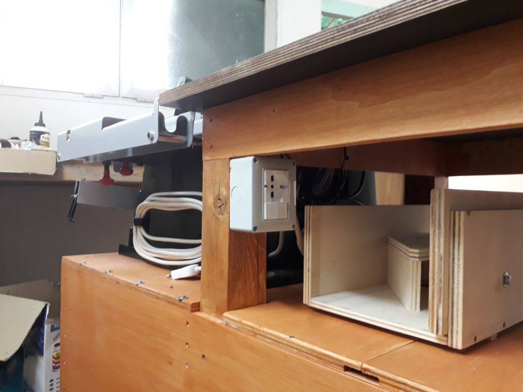 Come ti anticipavo, è un banco multiutensile formato da un cassone inferiore che fa da armadietto-cassettiera, oltre che da piano di appoggio per il banco sega, la parte superiore è il piano della sega, con prolunga in multistrato di betulla portante un attacco per fresatrice in conversione da banco, con tanto di guide per attrezzature varie (al momento ho all'attivo una guida scorrevole per incastri a pettine). In foto non si vede ma c'è anche una guida perpendicolare al piano. Il tutto con attacchi per l'aspirazione. L'aspiratore lo attacco alla presa in foto e a seconda dell'attrezzo selezionato mi parte in contemporanea o con la sega o con la fresa. Il tutto su comode ruote frenate.
