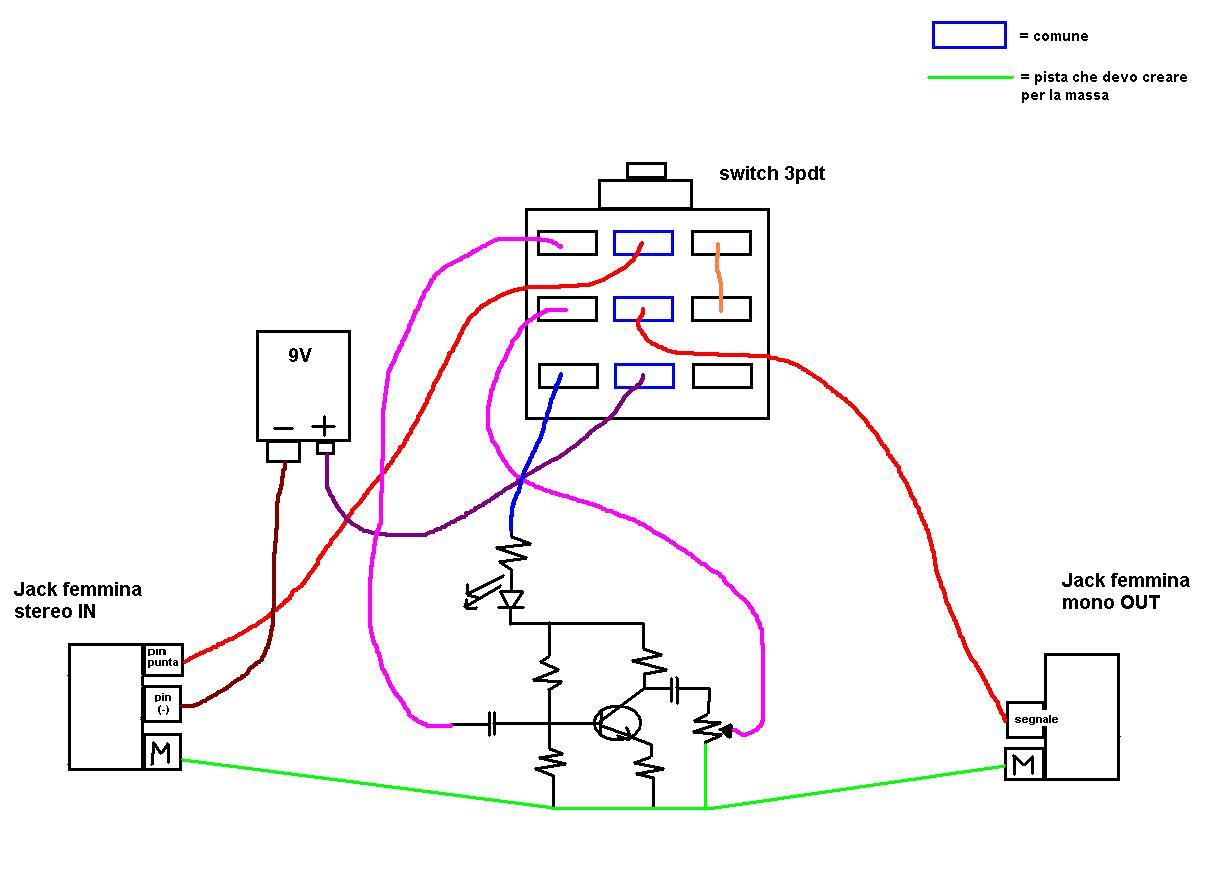Ora, per avere un true bypass con led devi fare i seguenti collegamenti: