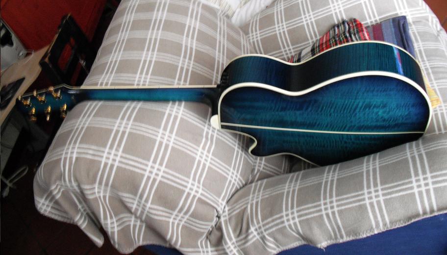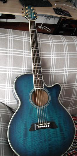 Vendo takamine modello trs 118 in dark blue sunburst. Modello molto raro in quanto prodotto solo tra il 90 e il 93 per il solo mercato europeo.Modello jumbo, é un'edizione limitata con tavola e fondo entrambi bombati, cassa, fasce e tavola in acero fiammato molto figurato e molto bello da vedere,manico in mogano e tastiera in palissandro, quadruplo binding sul corpo (back e top), binding su tastiera e paletta. Meccaniche dorate. La vera chicca e rarità di questa chitarra è il preamp STEREO, ha due uscite jack per gestire in maniera quasi indipendente le sei corde,