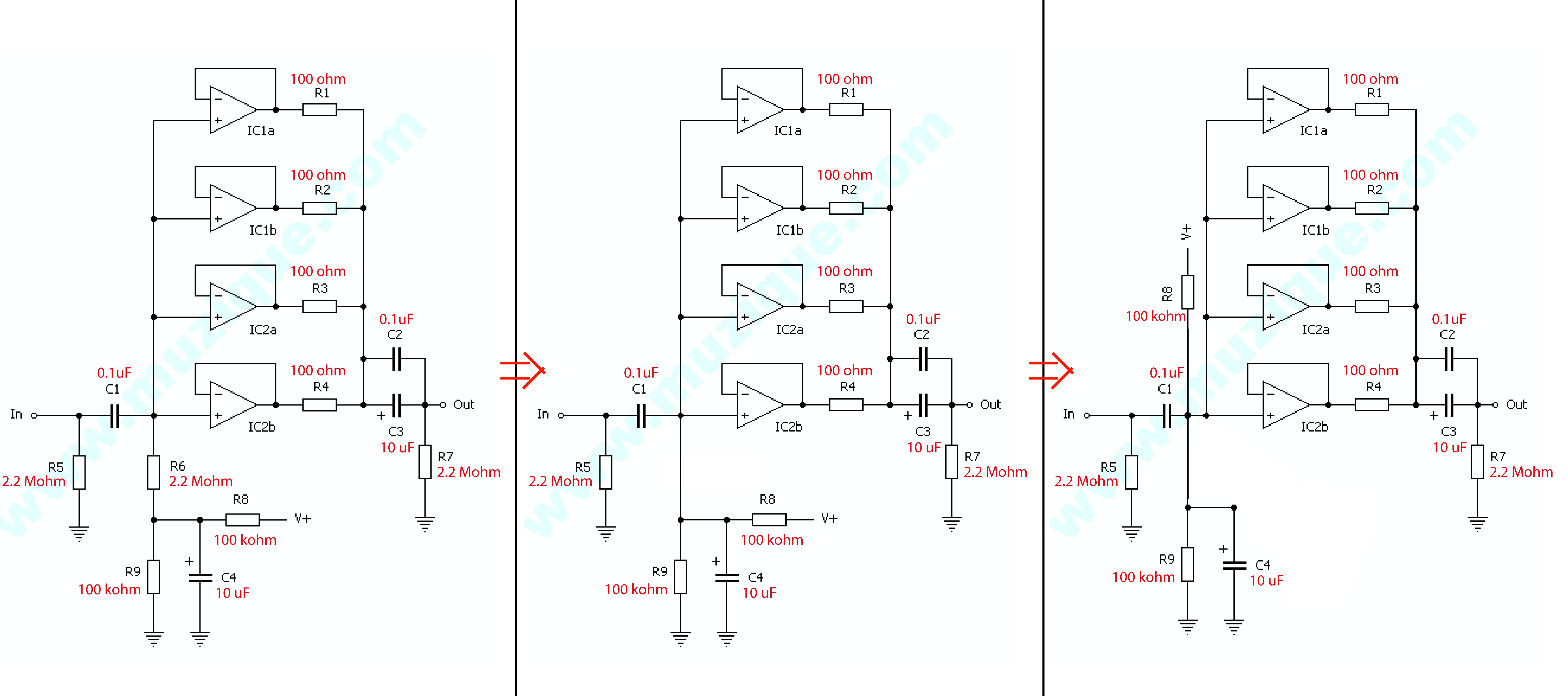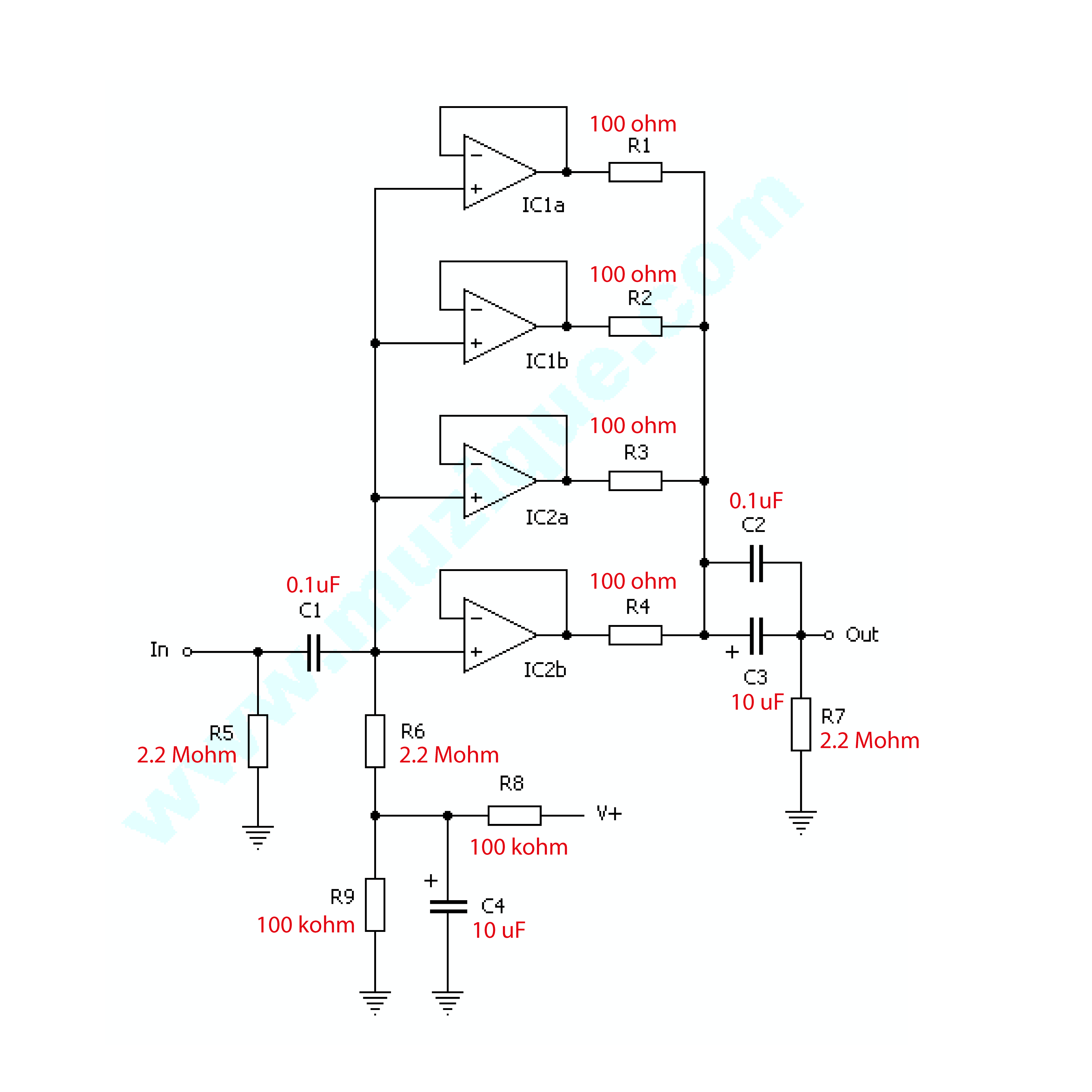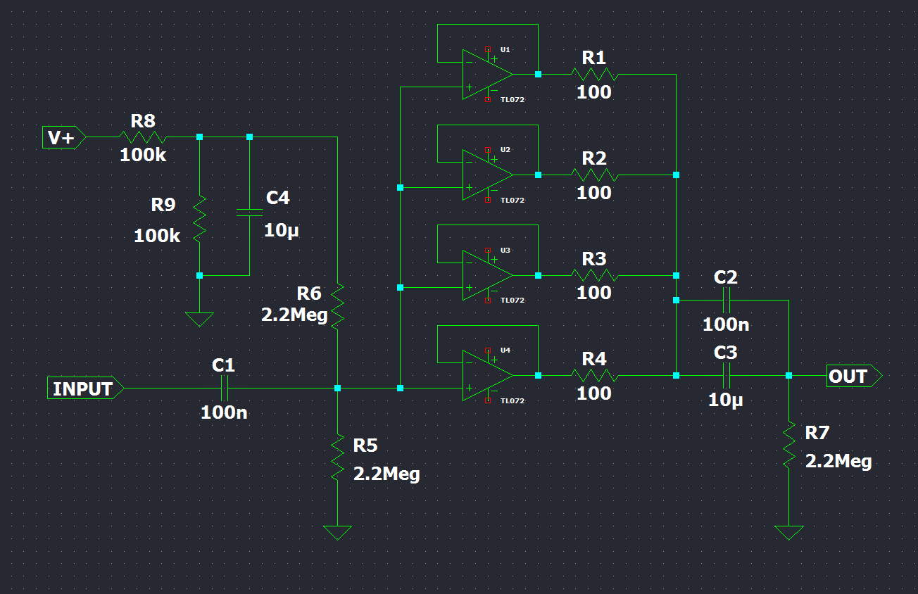 Ricordati che gli operazionali che usiamo nei pedali di solito funzionano con tensioni duali. Nel caso in cui volessi adoperare due batterie, oppure un dc-dc converter per avere +9V e -9V, non avresti le due resistenze R8 R9 ed il condensatore C4, ma dovresti comunque mettere la R6 sull'ingresso non invertente dell'IC, riferita alla massa vera e propria.