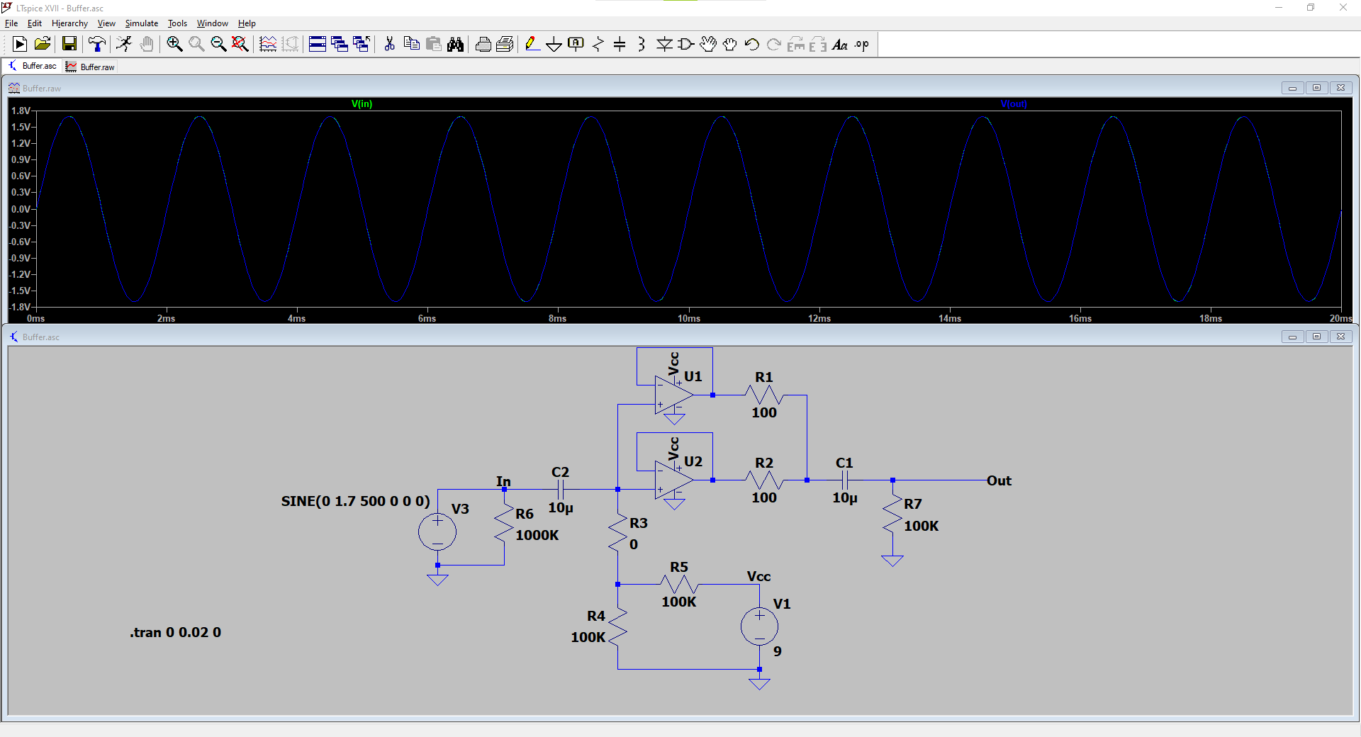 Vi allego anche una simulazione ponendo R9 (che qua diventa R3) in corto, dove In e Out coincidono.
