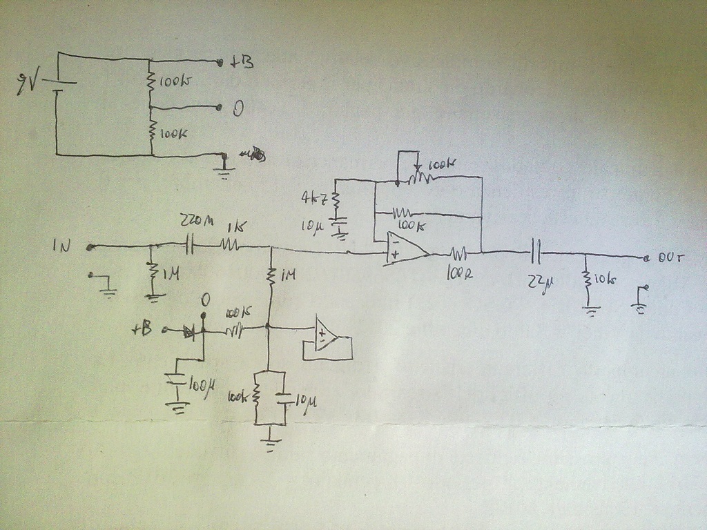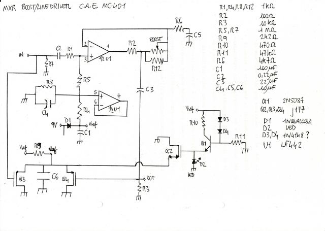 ho costruito un clone del suddetto pedale seguendo lo schema in allegato ma togliendo tutta la parte di switching...