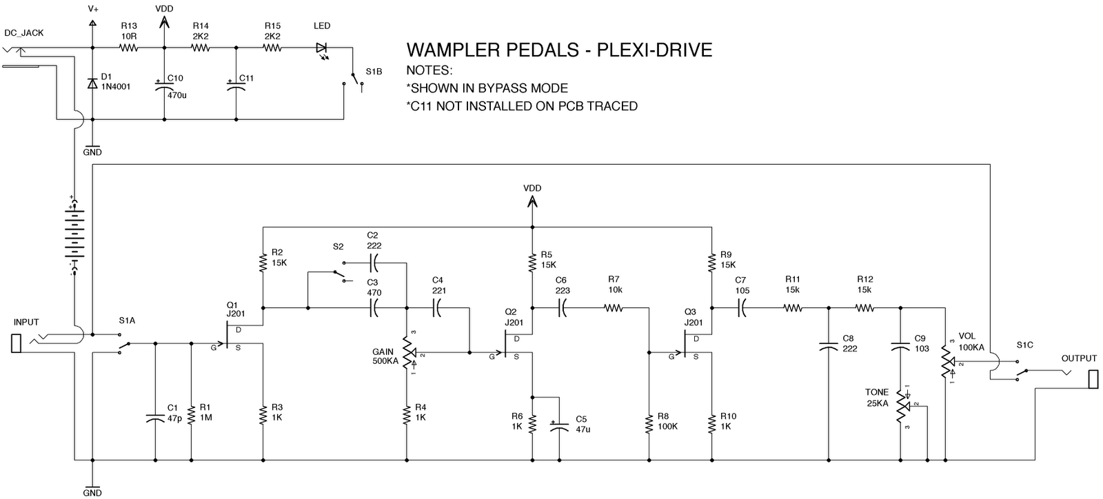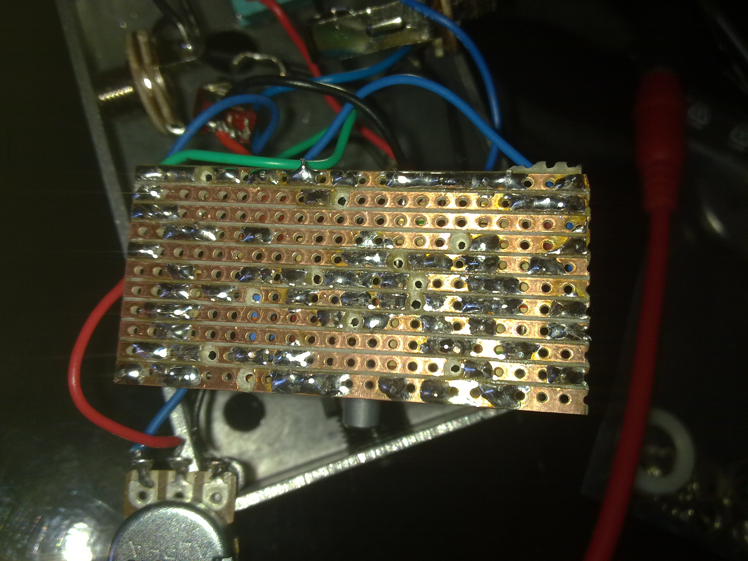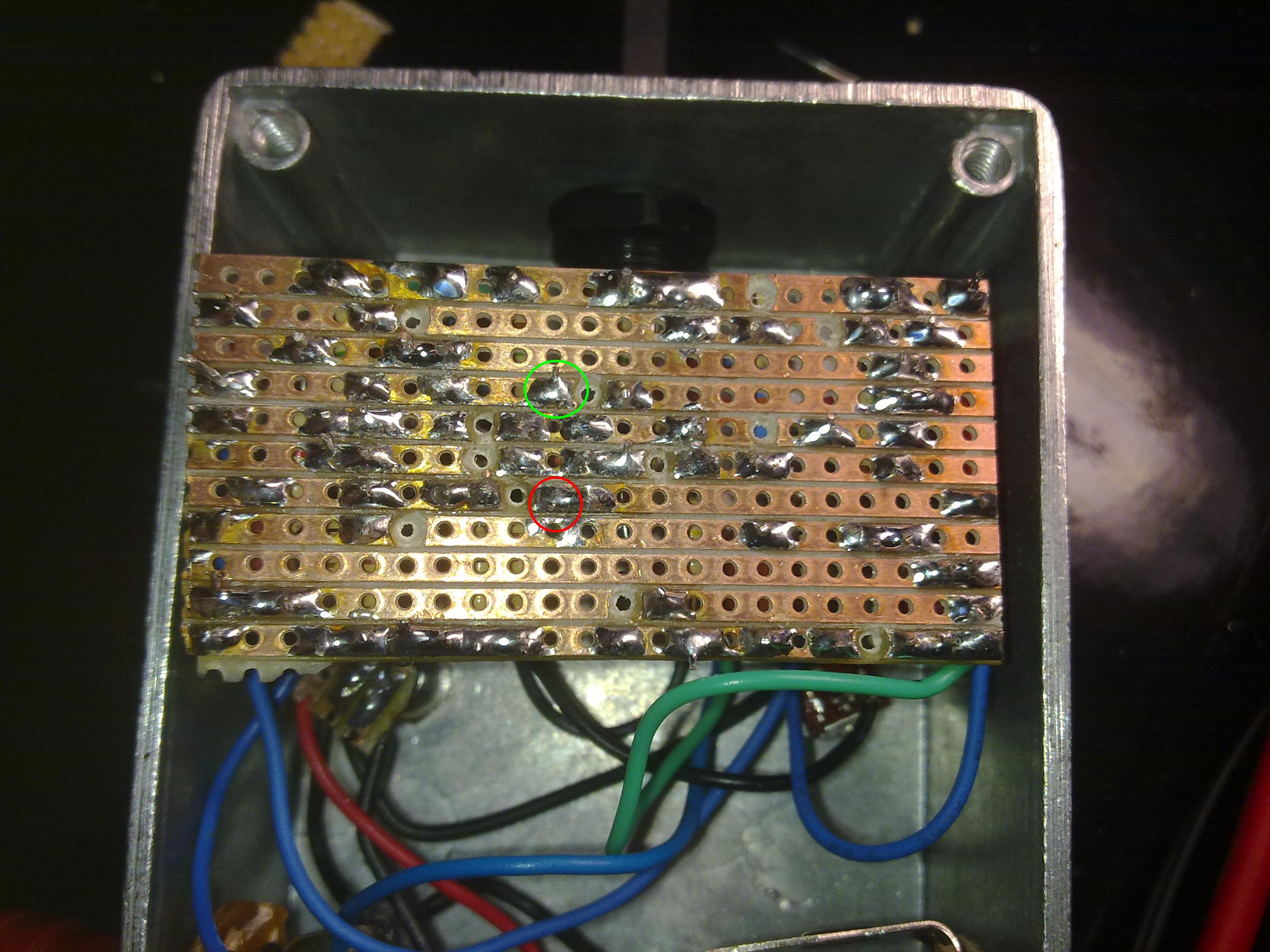 Vi allego foto della basetta, non mi sembra ci siano ponti tra le piste. Con l'audio probe il segnale esce dal primo j201 inalterato, e si ferma attraversando il condensatore da 220p cerchiato nella foto, o meglio entra ma non esce. Tra l'altro sulla pista in cui è questo condensatore il segnale si sente solo se il pot del gain non è a zero o al massimo, adesso non ricordo bene